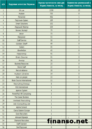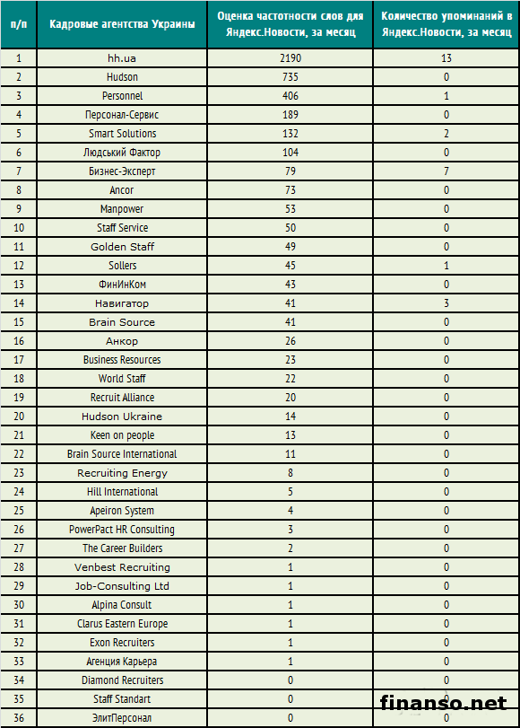 В нынешнем году достаточно сложно приходится и работодателям, и соискателям. Трудная финансовая, военная обстановка по всей стране заставила серьезно снизить затраты, заморозить проекты, сократить рабочий персонал. На трудовом рынке фиксировалось серьезное падение активности со стороны работодателей, рост активности со стороны соискателей. Однако несмотря на весьма плачевную ситуацию, кадровые агентства до сих пор часто предлагают открытые вакансии, помогают в вопросе поиска поиске квалифицированного персонала. Подробностями интересовались корреспонденты издания «Украина сегодня: Finanso.net». Какие именно кадровые агентства в настоящее время пользуются самой большой известностью у граждан Украины? С ответом на этот вопрос решили разобраться специалисты журнала для инвесторов и экономистов «Биржевой лидер». Рейтинг наиболее известных кадровых агентств Украины в сети.Рейтинг известности и востребованности кадровых агентств в Украине был сформирован на базе нескольких основных критериев: - оценка частотности слов для системы Яндекс.Директ за месяц, что была рассчитана при помощи сервиса wordstat.yandex.ru; - частота упоминаний о марках, что была рассчитана с помощью агрегатора news.yandex.ru (Яндекс.Новости); - регион анализа (то есть поиска в сервисе wordstat.yandex.ru) – Украина. Самые известные кадровые агентства в числе украинцев в сети: - hh.ua – 2 190 запросов в системе поиска Яндекс за месяц; - Hudson – 735 запросов в системе поиска Яндекс за месяц; - Personnel – 406 запросов в системе поиска Яндекс за месяц; - Персонал-Сервис – 189 запросов в системе поиска Яндекс за месяц; - Smart Solutions – 132 запроса в системе поиска Яндекс за месяц; - Людський Фактор – 104 запроса в системе поиска Яндекс за месяц; - Бизнес-Эксперт – 79 запросов в системе поиска Яндекс за месяц; - Ancor – 73 запроса в системе поиска Яндекс за месяц; - Manpower – 53 запроса в системе поиска Яндекс за месяц; - Staff Service – 50 запросов в системе поиска Яндекс за месяц. Аутсайдеры рейтинга популярности: - Recruiting Energy – 8 запросов в системе поиска Яндекс за месяц; - Hill International – 5 запросов в системе поиска Яндекс за месяц; - Apeiron System – 4 запроса в системе поиска Яндекс за месяц; - PowerPact HR Consulting – 3 запроса в системе поиска Яндекс за месяц; - The Career Builders – 2 запроса в системе поиска Яндекс за месяц; - Venbest Recruiting – 1 запрос в системе поиска Яндекс за месяц - Job-Consulting Ltd – 1 запрос в системе поиска Яндекс за месяц; - Alpina Consult – 1 запрос в системе поиска Яндекс за месяц. |
