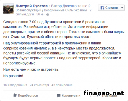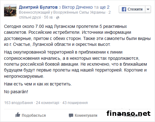 На своей странице в социальной сети «Фейсбук» бывший министр молодежи и спорта Украины Дмитрий Булатов, который в настоящее время воюет на украинском Донбассе, написал, что во вторник утром в небе над оккупированной частью Луганской области летали российские реактивные самолеты.