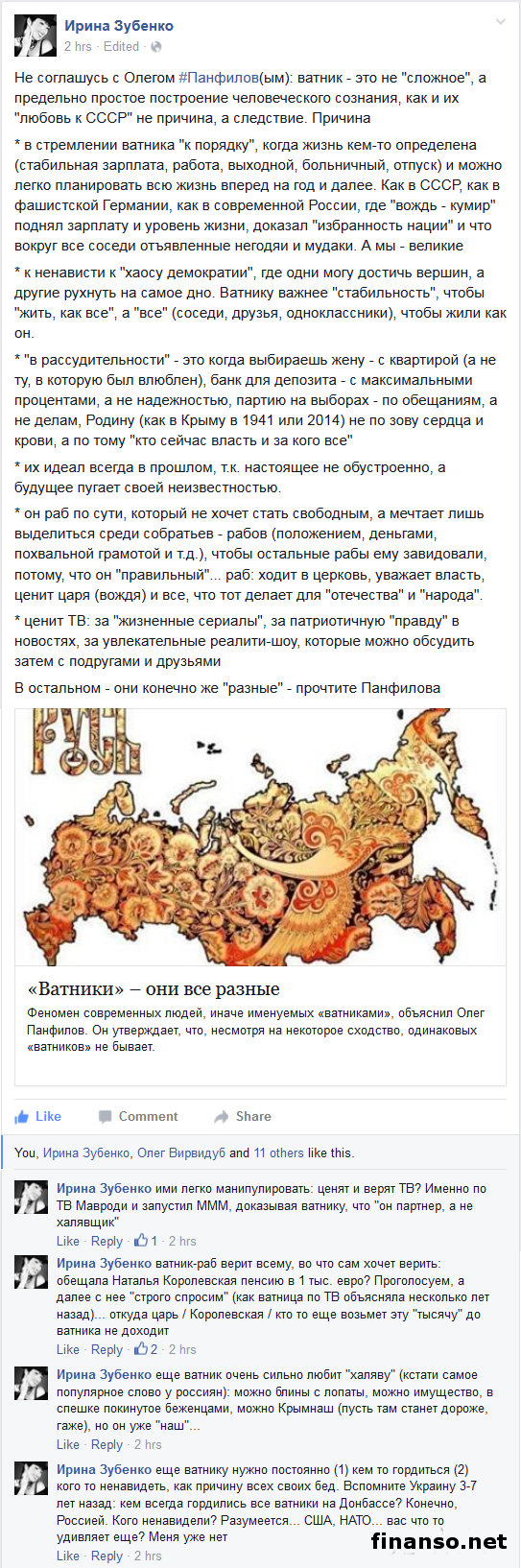 В связи с гибридным украино-российским противостоянием обостряются многие человеческие черты, малозаметные в мирный период времени. Известный блогер Ирина Зубенко сформулировала десять основных критериев, по которым можно четко определить «степень ватности» того или другого человека, как сообщает онлайн-издание по экономике и предпринимательству «Биржевой лидер». Подробностями интересовались корреспонденты издания «Украина сегодня: Finanso.net». Состояние необъявленной войны фактически внесло определенные коррективы в лексикон россиян и украинцев. В Украине непонятно откуда взялись «бандеровцы» и«укропы», в числе граждан России появились «колорады». Одновременно в двух государствах начали активно появляться «вышиватники» и «ватники». Первым непочетным титулом награждают украинцы своих же сограждан за преобладание патриотизма над вполне здравым смыслом. Характеристику «ватникам» как гражданам с особенностями сознания дал Олег Панфилов. Он отметил целый ряд необычных моментов «ватного» восприятия всего мира, пояснив феномен отсутствием в мозгу «ватника обыкновенного» некоторых сфер, основная часть из коих несет ответственность за знания. Именно тем, что знания «ватникам» заменяют данные, полученные от пропагандистов, можно легко пояснить странности в их поведении. Далеко не во всех моментах с господином Панфиловым готова полностью согласиться блогер Ирина Зубенко. Она подготовила целый список из 10 основных «критериев ватности», которые были навеяны историей России, а также определенными особенностями нынешних событий. По всей видимости, различные попытки как-то легко переубедить в чем-то обычного «ватника» бывают весьма познавательными. Предельно простое построение сознания, наиболее трепетное отношение к Стране Советов она считает результатом, а не основной причиной «ватности». Индикаторы «ватности». Блогер уверена: в самом обычном человеке, казалось бы, могут быть такие отличительные черты - причины особенностей его мировоззрения: - своеобразное стремление к порядку – то есть потребность в будущем; - ненависть к весьма «хаотичной демократии», что вытекает из потребности в порядке; - рассудительность, иногда не вполне уместная; - максимально идеалистичное отношение к минувшему, потому что настоящее плохо обустроено, а будущее вовсе туманно; - наличие рабской психологии, когда гранью мечтаний считается не обретение свободы, а выделение из толпы бесправных людей. |