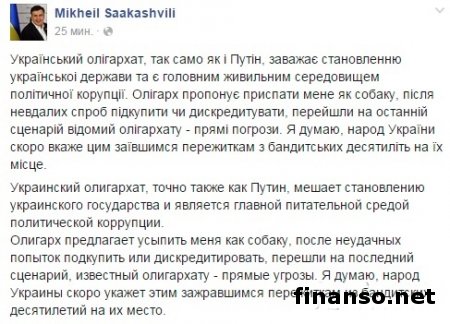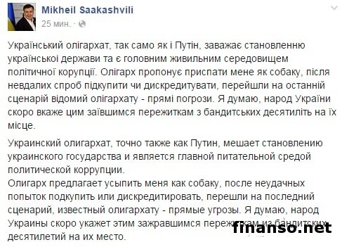 Украинский чиновник сравнил владельца группы «Приват», олигарха Игоря Коломойского с президентом Российской Федерации Владимиром Путиным. Как передают корреспонденты издания «Украина сегодня: Finanso.net», Михаил Саакашвили, глава Одесской областной государственной администрации ответил бизнесмену Игорю Коломойскому, который ранее сравнил его с собакой и наркоманом. В частности, на своей странице в социальной сети Facebook украинский чиновник сравнил олигарха Коломойского с российским президентом Владимиром Путиным. Так, Саакашвили написал: «Игорь Коломойский, идентично Путину, мешает становлению Украинского государства и является главной питательной средой политической коррупции». В это же время председатель Одесской областной государственной администрации заявил, что его пытались неудачно подкупить. При этом Михаил Саакашвили добавил: «Олигарх предлагает усыпить меня как собаку. После того, как попытки дискредитировать и подкупить меня не увенчались успехом, перешли на последний сценарий, хорошо известный олигархату – прямые угрозы. По моему мнению, совсем скоро украинский народ укажет этим зажравшимся пережиткам из бандитских десятилетий на их место». Правительство Украины подконтрольно олигархам - Саакашвили.Как сообщал ранее председатель Одесской областной государственной администрации Михаил Саакашвили, правительство Украины контролируют олигархи. В частности он подчеркивал, что премьер-министр Украины Арсений Яценюк отказался рассмотреть доклад относительно стоимости авиаперелетов и деятельности главы Государственной авиаслужбы Дениса Антонюка, который, насколько известно, 4 сентября 2015 года был уволен с занимаемой должности. Ранее сегодня «Украина сегодня: Finanso.net» сообщало, что бывший председатель Днепропетровской областной государственной администрации Игорь Коломойский прокомментировал заявления Михаила Саакашвили, губернатора Одесчины, о незаконном влиянии олигарха на отрасль пассажирских авиаперевозок в Украине, сравнив чиновника с «грязным наркоманом» и собакой. |