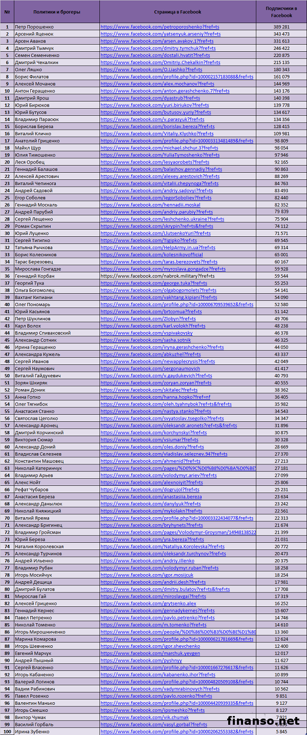 К настоящему моменту времени одним из самых известных занятий для современных людей стало отслеживание действий, размышлений, мнений разных популярных личностей по их страницам в соцсетях. При этом под параметр «популярные» попадают не только звезды кино, шоу-бизнеса, но и многочисленные политики, известные брокеры. Часто для этого на территории всей Украины пользователи глобальной сети Интернет применяют социальную сеть Facebook. Кто-то из них более известен, при том, что кто-то другой, как бы ни пытался, просто не может достичь того уровня известности, к которому так стремится. Подробностями интересовались корреспонденты издания «Украина сегодня: Finanso.net». Какие наиболее известные блогеры и политики Украины в соцсети Facebook? Ответом на этот вопрос интересовались специалисты издания «Биржевой лидер». ТОП-100 самых известных политиков, блогеров в Facebook.Для четкого определения самых известных аккаунтов блоггеров из Украины журналисты воспользовались простой, однако при этом надежной и проверенной схемой: подсчитали общее число подписчиков в аккаунтах участников нового рейтинга. Именно это общее число, считается индикатором известности политика/блогера, который важно всегда учитывать. Таблица показывает: - первое место в социальной сети «Фейсбук» занимает по праву Петр Алексеевич Порошенко – действующий президент Украины. Общее число подписчиков - 389 281 человек; - второе место - Арсений Яценюк, действующий премьер-министру страны со своими 343 473 подписчиками; - третье столь же почетное место за министром внутренних дел Украины Арсеном Аваковым. У него всего 331 613 подписчиками. В первой десятке лидеров рейтинга числятся: - Дмитрий Тымчук; - Дмитрий Чекалкин; - Семен Семенченко; - Олег Ляшко; - Анатолий Шарий; - Борис Филатов; - Алексей Мочанов. А далее размещаются такие политики: - Дмитрий Ярош; - Юрий Бутусов; - Юрий Бирюков; - Владимир Парасюк; - Виталий Кличко; - Борислав Береза; - Анатолий Гриценко; - Юлия Тимошенко; - Майкл Щур; - Леся Оробец; - Геннадий Балашов; - Виталий Чепинога; - Алексей Арестович; - Андрей Садовой; - Геннадий Москаль; - Егор Соболев; - Андрей Парубий; - Роман Скрыпин; - Сергей Лещенко; - Юрий Луценко; - Татьяна Рычкова; - Сергей Тигипко; - Борис Колесников; - Мирослава Гонгадзе; - Тарас Березовец; - Геннадий Корбан; - Георгий Тука; - Олег Пономарь; - Ольга Богомолец; - Вахтанг Кипиани; - Юрий Касьянов; - Карл Волох; - Петр Шуклинов; - Татьяна Монтян; - Владимир Спиваковский; - Александра Кужель - Александр Сотник; - Ирина Геращенко; - Сергей Иванов; - Виталий Гайдукевич; - Сергей Наумович; - Зорян Шкиряк; - Анна Гопко; - Роман Доник; - Олег Тягнибок. |