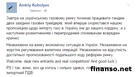 На своей странице в социальной сети «Фейсбук» глава правления НАК «Нафтогаз Украины» Андрей Коболев сообщил, что в четверг, 24 сентября 2015 года, на газовом рынке Украины работу начнут два западных трейдера.