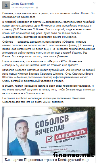 На своей странице в социальной сети «Фейсбук» журналист из оккупированного боевиками Донецка Денис Казанский написал, что от президентской политической силы «Блок Петра Порошенко «Солидарность» в Киевский областной совет выдвигается собственник сети донецких супермаркетов, работающих на сепаратистов, зять российского олигарха Вячеслав Соболев.