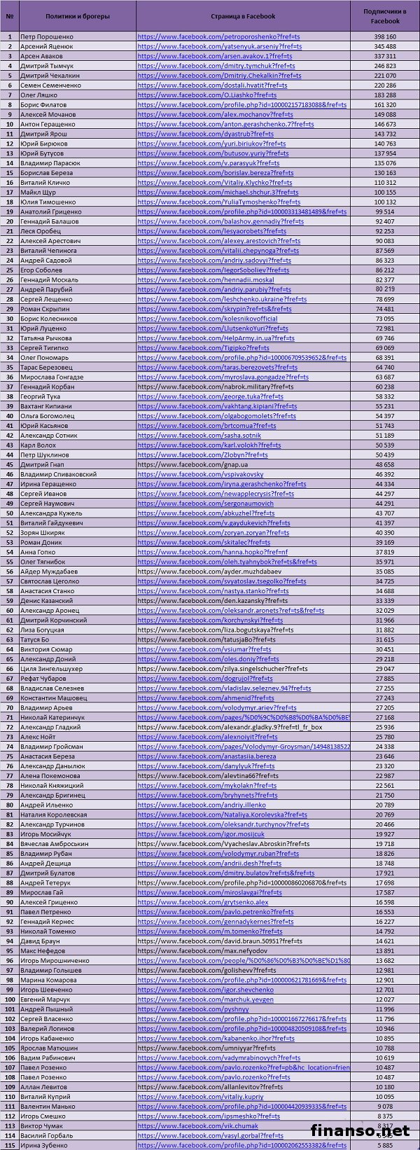 У большинства людей, которые пользуются соцсетью Facebook, чтение обновленной ленты новостей вошло в привычку. В то же время все чаще в ленте мелькают достаточно популярные блогеры и политики. Проблема в том, что в последнее время отслеживание мыслей и действий разных популярных личностей по их страницам в соцсетях считается одним из самых распространенных занятий в глобальной сети Интернет. Зачастую для этого в Украине пользователи глобальной сети используют социальную сеть Фейсбук. Кто-то из них более известный, при этом кто-то другой, как бы ни старался, не способен достичь того уровня известности, которого ему бы так хотелось. Подробностями интересовались корреспонденты издания «Украина сегодня: Finanso.net». Какие наиболее известны блогеры и политики Украины в соцсети Facebook? С этим вопросом разбирались эксперты портала по экономике «Биржевой лидер». ТОП- политиков, блогеров в соцсети Facebook за октябрь.Из данных таблицы видно, что: - первое место по известности среди украинских блогеров и политиков в соцсети «Фейсбук» занимает Петр Алексеевич Порошенко, действующий ныне президент Украины. Общее число его подписчиков составляет порядка 398 160 человек; - второе не менее почетное место досталось на этот раз Арсению Петровичу Яценюку, действующему премьер-министру, с 345 488 подписчиками; - третье место таблицы лидеров нынешнего рейтинга закрывает министр внутренних дел Украины Арсен Аваков с 337 311 подписчиками. В ТОПе-10 лидеров этого рейтинга: - Дмитрий Тымчук - 246 823 подписчика; - Дмитрий Чекалкин - 221 070 подписчика; - Семен Семенченко - 220 286 подписчика; - Олег Ляшко - 183 288 подписчиков; - Борис Филатов - 161 320 подписчиков; - Алексей Мочанов - 149 088 подписчиков; - Антон Геращенко - 146 673 подписчика. А далее размещаются такие популярные политики: - Дмитрий Ярош - 143 732 подписчика; - Юрий Бирюков - 140 763 подписчика; - Юрий Бутусов - 137 954 подписчика; - Владимир Парасюк - 135 076 подписчиков; - Борислав Береза - 130 163 подписчика; - Виталий Кличко - 110 312 подписчиков; - Майкл Щур - 100 155 подписчиков; - Юлия Тимошенко - 100 132 подписчика; - Анатолий Гриценко - 99 514 подписчиков; - Геннадий Балашов - 92 407 подписчиков; - Леся Оробец - 92 253 подписчика; - Алексей Арестович - 90 083 подписчика; - Виталий Чепинога - 87 569 подписчика; - Андрей Садовой - 86 323 подписчика; - Егор Соболев - 86 212 подписчиков; - Геннадий Москаль - 82 377 подписчиков; - Андрей Парубий - 80 219 подписчиков; - Сергей Лещенко - 78 699 подписчиков. |