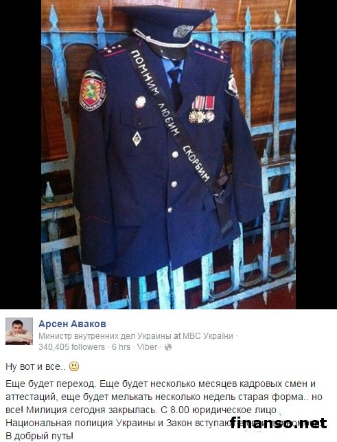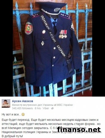 Председатель Министерства внутренних дел Украины Арсен Аваков на своей странице в социальной сети «Фейсбук» написал, что в Украине свое существование прекратила милиция.
