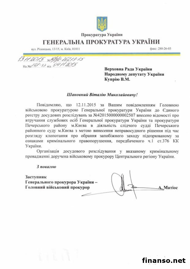 Главной военной прокуратурой ГПУ Украины внесены сведения в Единый реестр досудебных расследований о вмешательстве замгенпрокурора Юрия Столярчука и прокурора Печерского района Киева Игоря Демидова в деятельность суда по делу Геннадия Корбана. Об этом сообщил на своей странице в соцсети «Фейсбук» внефракционный парламентарий, один из лидеров УКРОПа Виталий Куприй. Данным вопросом интересовались корреспонденты издания «Украина сегодня: Finanso.net».Указанное производство было открыто по признакам уголовного преступления, согласно ч. 1 ст. 376 украинского Уголовного кодекса (вмешательство в деятельность судьи с целью помешать выполнению им служебных обязанностей или добиться неправосудного решения). Как это уже сообщалось, журналистами канала «1+1» 4 ноября было зафиксировано, как до начала работы Печерского райсуда столицы, где рассматривалось ходатайство об избрании меры пресечения Геннадию Корбану, его посетили замгенпрокурора Юрий Столярчук и прокурор Печерского района Киева Игорь Демидов. Госчиновники ГПУ требовали принятия против Корбана неправосудного решения.Госчиновники требовали принятия против Корбана заведомо неправосудного решения и применения к нему пресечения в виде ареста. На своей странице в соцсети «Фейсбук» нардеп Виталий Куприй тогда сообщил, что таким образом Юрием Столярчуком было совершено преступление, предусмотренное ст. 376 украинского УК, и он должен ответить перед законом. На такой произвол не реагировать он не мог, исходя из чего направил соответствующее заявление замгенпрокурору Давиду Сакварелидзе и в Национальное антикоррупционное бюро Украины. По свидетельству журналистов ТСН, они после этого позвонили непосредственно Юрию Столярчуку, пытаясь взять у него по этому поводу комментарий, однако, услышав вопрос о цели его пребывания в Печерском суде, замгенпрокурора бросил трубку. Напомним также, что накануне Печерский райсуд Киева своим решением обязал Генпрокуратуру начать расследование незаконных действий следователей по делу лидера УКРОПа Геннадия Корбана. Об этом на своей странице в «Фейсбуке» написал один из адвокатов политика – Алексей Шевчук. Шевчук написал, что сделан еще один шаг к победе Геннадия Корбана. По заявлению об уголовных правонарушениях, совершенных следователями Скубой и Макеевым в отношении Корбана Г. О., Печерский суд обязал ГПУ внести сведения в Единый реестр досудебных расследований. Как уже сообщалось, Киевский райсуд решил, что лидер партии «УКРОП» Геннадий Корбан должен провести под домашним арестом два месяца до 31 декабря 2015 г. |