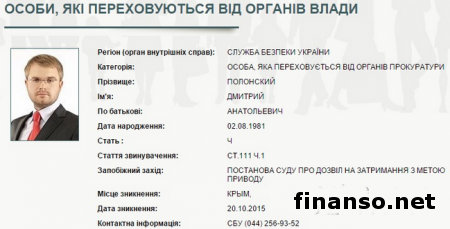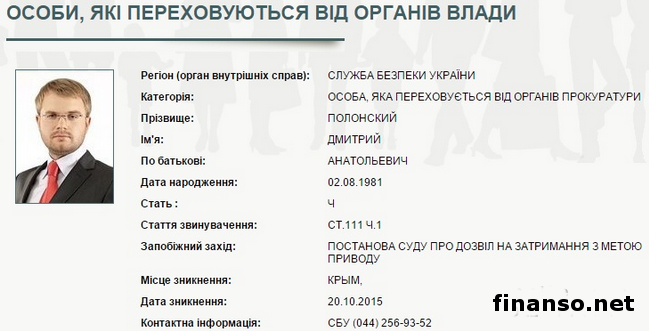 На официальном сайте Министерства внутренних дел Украины сообщается, что Служба безопасности Украины объявила так называемого вице-премьер-министра Автономной Республики Крым Дмитрия Полонского в розыск.