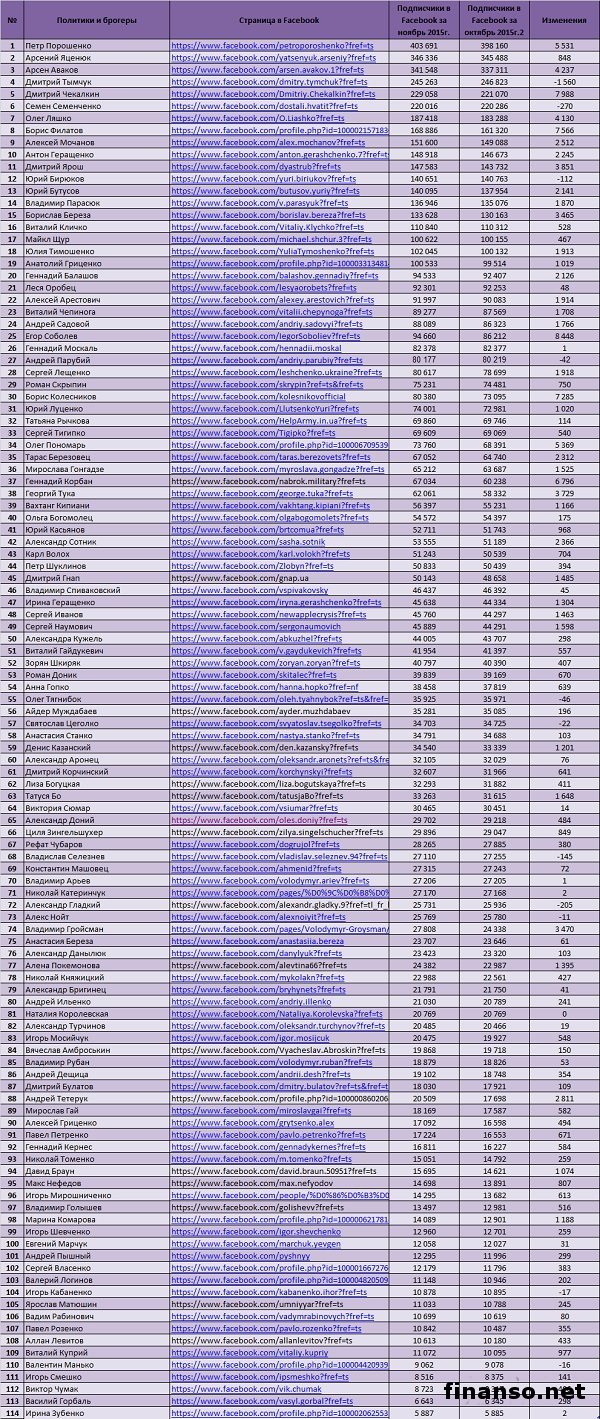 У большинства людей, которые пользуются соцсетью «Фейсбук», чтение новостной ленты вошло в привычку. В то же время все чаще и чаще в этой ленте начинают мелькать достаточно популярные блогеры и политики. Проблема в том, что в последнее время отслеживание мыслей и действий разных популярных личностей по их страницам в соцсетях считается одним из самых широко распространенных занятий в глобальной сети Интернет. Подробностями интересовались корреспонденты издания «Украина сегодня: Finanso.net». Наиболее часто для этого в Украине пользователи глобальной сети Интернет применяют социальную сеть «Фейсбук». Какие наиболее известные украинские блогеры и политики в соцсети «Фейсбук»? Ответ на этот вопрос искали специалисты издания «Биржевой лидер». ТОП-известных блогеров и политиков Facebook.Для определения самых известных аккаунтов блогеров Украины, журналисты воспользовались простой, но при этом хорошо проверенной, реально надежной схемой: подсчет числа подписчиков в аккаунтах участников рейтинга. Именно это количество считается по праву индикатором известности политика/блогера, что нужно всегда брать в учет. Таблица показывает: - первое место популярности в числе блогеров и политиков Украины в соцсети «Фейсбук» занимает Петр Алексеевич Порошенко, нынешний глава Украины. Общее число подписчиков достигает 403 691 человек; - второе место отдано Арсению Яценюку, нынешнему украинскому премьер-министру, с 346 336 подписчиками; - третье место этого рейтинга досталось по праву украинскому министру внутренних дел Арсену Авакову с его 341 548 подписчиками. В ТОП-10 лидеров рейтинга входят: - Дмитрий Тымчук - 245 263 подписчика; - Дмитрий Чекалкин - 229 058 подписчиков; - Семен Семенченко - 220 016 подписчиков; - Олег Ляшко - 187 418 подписчиков; - Борис Филатов - 168 886 подписчиков; - Алексей Мочанов - 151 600 подписчиков; - Антон Геращенко - 148 918 подписчиков. Далее следуют: - Дмитрий Ярош; Юрий Бутусов; - Юрий Бирюков; - Борислав Береза; - Владимир Парасюк; - Виталий Кличко; - Юлия Тимошенко; - Майкл Щур; - Анатолий Гриценко; - Леся Оробец; - Геннадий Балашов; - Алексей Арестович; - Андрей Садовой; - Виталий Чепинога; - Егор Соболев; - Андрей Парубий; - Геннадий Москаль; - Сергей Лещенко; - Борис Колесников; - Роман Скрыпин; - Юрий Луценко; - Сергей Тигипко; - Татьяна Рычкова; - Олег Пономарь; - Мирослава Гонгадзе; - Тарас Березовец; - Геннадий Корбан. |