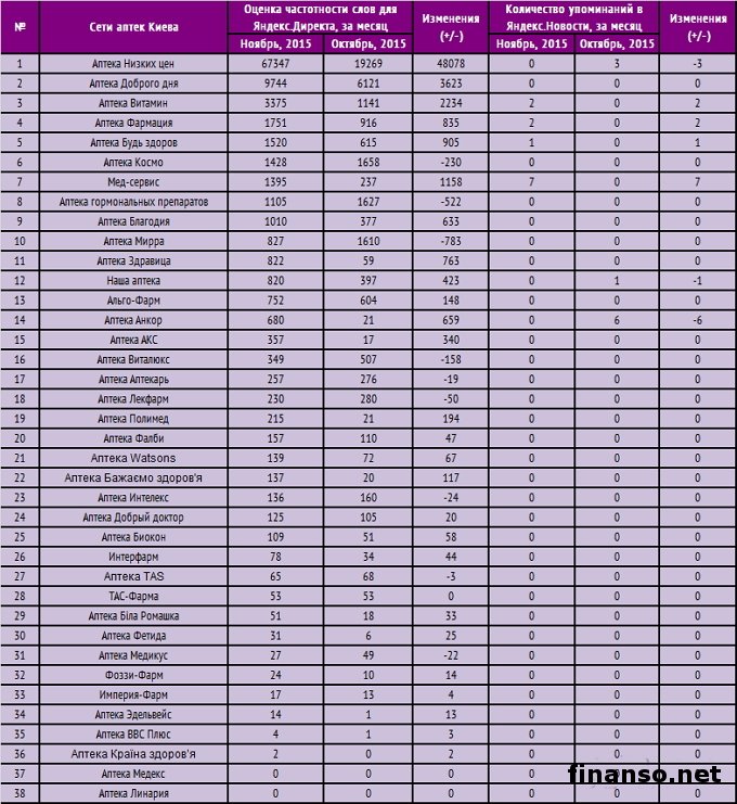Фактически каждый украинец в меньшей или большей степени нуждается в товарах аптечных сетей. Именно по этой причине они часто пользуются большим спросом. И доверять потребители склонны компаниям, что уже успели себя зарекомендовать на рынке государства, гарантируют высочайшее качество продающейся продукции. Подробностями интересовались корреспонденты издания «Украина сегодня: Finanso.net». Какие аптечные сети в настоящее время пользуются самой большой популярностью у граждан города Киев, всей области? С этим вопросом пытались разобраться специалисты информационно-аналитического издания «Биржевой лидер». ТОП популярности сети аптек в Киеве за ноябрь 2015 года.Рейтинг известности аптечных сетей в числе жителей Киева, Киевской области формируется на основании таких основных критериев: - оценка частотности слов для системы поиска Яндекс.Директа за один месяц, что рассчитана с помощью сервиса wordstat.yandex.ru; - общее количество упоминаний за то же время период в электронных СМИ, что рассчитано с помощью агрегатора Яндекс.Новости (news.yandex.ru); - регион анализа (то есть поиска в сервисе wordstat.yandex.ru) – Киев и Киевская область: Из табличных показателей можно сделать выводы о том, что самые известные среди жителей Киева, всей области считаются такие аптечные сети: 1. Сеть «Аптека Низких цен» (67 347 запросов поиска в Яндекс за месяц) предоставляет свыше 16 000 наименований высококачественной продукции, что соответствует наиболее высоким стандартам. Сеть презентована большим выбором форматов, начиная аптечными пунктами в областных центрах до имиджевых столичных аптек. 2. Сеть аптек «Доброго дня» (9 744 запроса в системе поиска Яндекс) презентует большой ассортимент товаров, гарантируя тем самым их подлинность, высокий уровень обслуживания, демократичные цены. Сеть обладает открытой зоной самообслуживания, за счет которой покупатели могут сами подобрать необходимый товар для здоровья, обретя тем самым квалифицированную консультацию эксперта. 3. Сеть аптек «Витамин» (3 375 запросов в поисковой системе Яндекс за последний месяц) поможет в приобретении лекарственных средств, домашних медприборов, детского питания. Менее интересными признаны аптечные сети в Киеве: - Аптека «Фармация» – 1 751 запрос в Яндекс; - Аптека «Будь здоров» – 1 520 запросов в Яндекс; - Аптека «Космо» – 1 428 запросов в Яндекс; - Мед-сервис – 1 395 запросов в Яндекс; - Аптека гормональных препаратов – 1 105 запросов в Яндекс; - Аптека «Благодия» – 1 010 запросов в Яндекс; - Аптека «Мирра» – 827 запросов в Яндекс. |