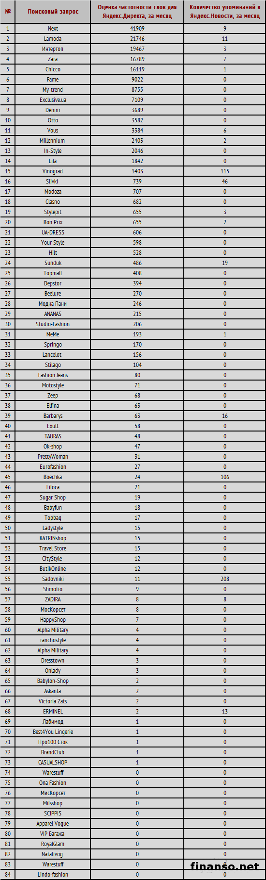 ![]() Как раз здесь на помощь приходит великий и могучий Интернет. Именно в этой области есть множество онлайн-магазинов одежды, которые предлагают различные модели от разных производителей. И для выбора из данного многообразия наиболее выгодных предложений, компаний, необходимо обратить внимание на их известность среди граждан Украины. С этим вопросом разбирались специалисты информационно-аналитического издания «Биржевой лидер». Топ известности онлайн-магазинов одежды Украины.Рейтинг известности онлайн-магазинов одежды формируется по трем главных критериям: - оценка частотности слов для системы поиска Яндекс.Директ за месяц, что рассчитана при помощи сервиса wordstat.yandex.ua; - частота упоминаний о магазине в онлайн-изданиях, что рассчитана при помощи агрегатора news.yandex.ua (Яндекс.Новости); - регион анализа (то есть поиска в сервисе wordstat.yandex.ru) – Украина. Первое место отдано по праву онлайн-магазину Next с его 41 909 запросами за месяц в системе поиска Яндекс. Next относится к числу современных ресурсов с достаточно качественными товарами по наиболее оптимальным ценам. Второе место досталось вполне заслуженно в этом месяце популярному бренду Lamoda – 21 746 запросов в Яндекс за последний месяц. Это самый большой магазин онлайн модной одежды, обуви, аксессуаров в Украине. Здесь можно купить разные модные новинки с доставкой на дом. Третье столь же почетное место досталось магазину «Интертоп» с его 19 467 запросами за месяц. Далее позиции рейтинга были распределены таким образом: - Zara – 16 789 запросов за месяц в Яндекс; - Chicco – 16 119 запросов за месяц в Яндекс; - Fame – 9 022 запроса за месяц в Яндекс; - My-trend – 8 755 запросов за месяц в Яндекс; - Exclusive.ua – 7 109 запросов за месяц в Яндекс; - Denim – 3 689 запросов за месяц в Яндекс; - Otto – 3 582 запроса за месяц в Яндекс. |