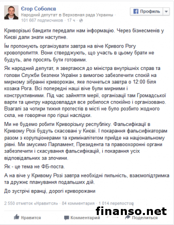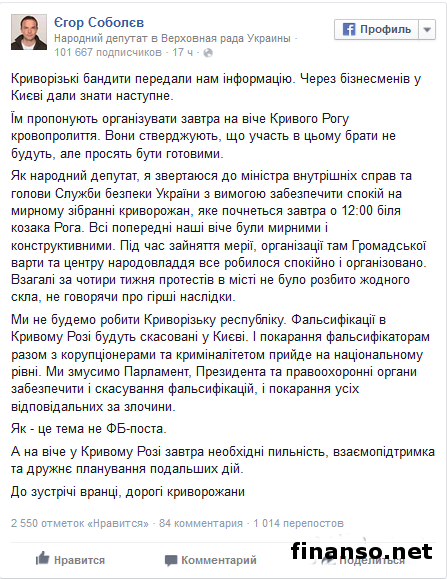 В Днепропетровской области в Кривом Роге в воскресенье, 13 декабря текущего года, продолжается народное вече, направленное против признания действительными результатов проведенных выборов мэра города. Как передают украинские средства массовой информации, на площади в Кривом Роге собрались сотни людей, имеющих цель поддержать «Самопомощь», которая по официальным результатам осенью проиграла в городе местные выборы. Корреспонденты издания «Украина сегодня: Finanso.net» передают, что митинг в Кривом Роге начался с гимна Украины. На своей странице в социальной сети «Фейсбук» народный депутат Украины Егор Соболев, в свою очередь, сообщил, что участники акции готовы к провокации во время сегодняшнего вече. Накануне митинга Егор Соболев написал: «Нам передали информацию криворожские бандиты. В Киеве через бизнесменов дали знать следующее. Им предлагают организовать завтра на вече Кривого Рога кровопролитие. Они утверждают, что участие в этом принимать не будут, однако просят быть готовыми. Во время вече в Кривом Роге завтра необходимы бдительность, взаимовыручка, а также планирование дальнейших действий». Один из украинских телеканалов передает, что в акции против признания результатов выборов мэра города принимает участие от 500 до 700 человек. Примечательно, что перед участниками акции протеста со сцены выступили народные депутаты Украины и члены инициативной группы, которая с требованием назначить перевыборы городского головы ездила в Киев. Представители средств массовой информации, присутствующие на вече, прокомментировали ситуацию так: «Инициативная группа говорит, что они еще будут ездить в Киев, и там будут проводить митинги. А для того, чтобы депутаты приняли закон, и в Кривом Роге было переголосование, они готовы давить на депутатов». Отмечается, что обстановка на вече достаточно спокойная, территорию патрулируют порядка 1500 полицейских, 500 силовиков в настоящее время находится в резерве. |