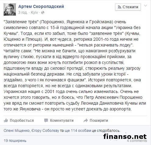 По словам Скоропадского, «заявление трех» (Порошенко, Яценюка и Гройсмана) очень символично совпало с 15-й годовщиной начала акции «Украина без Кучмы». Он напомнил, что тогда также было «заявление трех» (Кучмы, Ющенко и Плюща). Риторика 2001-го года, что примечательно, совершенно не отличается от нынешней риторики – «нельзя раскачивать лодку». Скоропадский продолжил: «Читайте сами – «нельзя не видеть попыток использовать уличную стихию, пустив в ход по-настоящему провокационные приемы, с помощью которых они хотят углубить раскол в обществе, подтолкнув власть к силовому противодействию, создав реальную угрозу нацбезопасности страны. Не надо забывать уроки истории – вспомните, с чего начинался фашизм». История всегда повторяется, но в итоге с разными результатами.«История повторяется, она всегда повторяется, но не всегда с одинаковыми результатами», - написал спикер ПС. Он добавил при этом, что с 2001 г. украинская нация очень сильно изменилась. По его словам, очень не хотелось этого говорить, но он боится, что Петр Алексеевич Порошенко уже навряд ли сможет повторить судьбу Леонида Даниловича Кучмы или того же Януковича, поскольку он просто не успеет доехать до аэропорта. Напомним, что вечером 15 декабря глава Украины Петр Порошенко, премьер Арсений Яценюк и руководитель украинского парламента Владимир Гройсман сделали совместное заявление, в котором указали на некоторые действия власти, которые она намерена совершить в ближайшее время. «В настоящее время, - отмечалось в заявлении, - нашему государству необходима совместная работа главы государства и парламентариев, а вопрос о замене премьера не стоит на повестке дня». Руководство страны призвало успокоить политические амбиции и проявить культуру, присущую любому из европейских государств. В заявлении премьера, президента и спикера парламента отмечается, что в государстве разворачивается «истерическая и антигосударственная кампания», которую организуют олигархические кланы. |