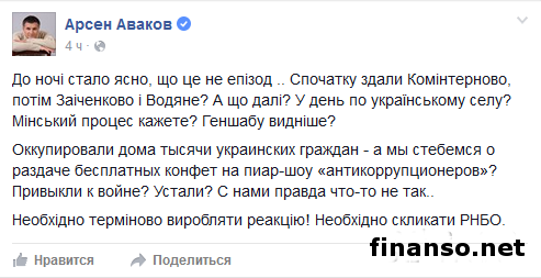 Так, как выяснили корреспонденты «Украина сегодня: Finanso.net», Арсен Аваков написал: «То, что это не эпизод, нам стало ясно к ночи. Первоначально сдали Коминтерново, после этого – Заиченко, и в итоге – Водяное. А что же будет дальше? Каждый день боевики будут захватывать по украинскому поселку? Говорите, Минский процесс? Генеральному штабу виднее? Нужно незамедлительно производить соответственную реакцию! Надо срочно созвать Совет национальной безопасности и обороны». В это же время министр добавил: «Боевики оккупировали дома тысячи украинцев, а мы стебемся о раздаче бесплатных конфет на пиар-шоу...? К войне привыкли? Или может устали? С нами, правда, что-то не так». Ситуация с Коминтерново.Насколько известно, ранее председатель Донецкой областной военно-гражданской администрации Павел Жебривский сообщил, что неизвестно, зашли ли в села Заиченково, Коминтерново и Водяное незаконные вооруженные формирования, однако связи с этими населенными пунктами нет. В свою очередь, Алексей Мазепа, руководитель пресс-центра штаба АТО, во вторник заявил, что группа террористов самопровозглашенной Донецкой народной республики на бронетехнике заняли поселок Коминтерново, который входит в «серую зону» в зоне проведения антитеррористической операции. Между тем информацию об окружении боевиками Коминтерново также подтвердили и сами местные жители. При этом они уточнили, что в Коминтерново на бронетехнике зашла рота террористов Донецкой народной республики и рассредоточилась по поселку. В это же время другой источник сообщил, что «порядка пятидесяти человек на БМП прибыли в поселок, вероятно, с минометами, ищут дома, куда бы можно было заселиться. |