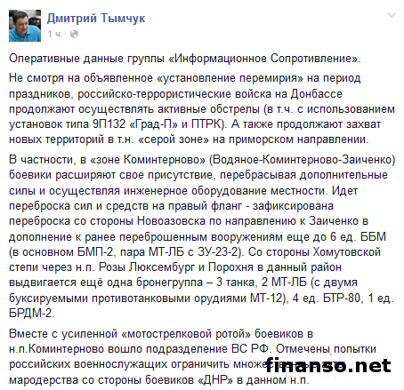 В населенный пункт Коминтерново вместе с усиленной «мотострелковой ротой» террористов вошло подразделение Вооруженных сил Российской Федерации. Народный депутат Верховной Рады Украины, координатор группы «Информационное сопротивление» Дмитрий Тымчук на своей странице в Facebook написал, что в этом поселке на юге фронта отмечены попытки российских оккупантов ограничить мародерство со стороны незаконных вооруженных формирований самопровозглашенной Донецкой народной республики. Как удалось выяснить корреспондентам «Украина сегодня: Finanso.net», Тымчук написал: «Несмотря на объявленный режим полной тишины на период праздников, на Донбассе российско-террористические войска продолжают осуществлять активные обстрелы сил АТО. Кроме того, НВФ продолжают захват новых территорий в так называемой серой зоне на Приморском направлении. В особенности, пророссийские боевики расширяют свое присутствие в «зоне Коминтерново» (Водяное-Коминтерново-Заиченко), перебрасывая туда дополнительные силы и осуществляя инженерное оборудование местности. Примечательно, что в населенный пункт Коминтерново, вместе с усиленной «мотострелковой ротой» террористов, вошло подразделение Вооруженных сил РФ. Были отмечены попытки военных РФ ограничить в данном населенном пункте неоднократные акты мародерства со стороны боевиков самопровозглашенной Донецкой народной республики. Какое вооружение используют боевики на Донбассе?Сообщается, что в районе населенного пункта Гранитное зафиксировано использование террористами противотанкового ракетного комплекса. В том числе, пехотная группа террористов, занимавшая ранее позиции в районе Красного Октября, выдвинулась на передний край севернее Гранитного, в сторону Новогригорьевки на автотранспорте с ПТРК. Заняв нужные позиции, боевики сделали два выстрела из ПТРК в сторону блока-поста сил антитеррористической операци северо-западнее Гранитного. Кроме того, боевики обстреляли позиции украинской армии между населенными пунктами Майорск и Шумы из стрелкового оружия и двухтанковых гранатометов АГС-17. Огонь велся с двух точек – со стороны улицы Смирнова и с Поселка 6-7. |