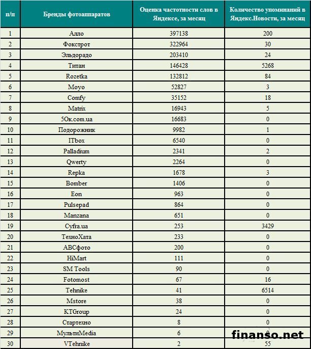 Сейчас фотоаппарат используется в качестве инструмента для развлечений, фотографирования каких-то жизненных событий. Для большинства людей это еще и отличный способ хорошо заработать, сделать фотографию основным своим заработком. Однако для этого крайне важно приложить максимум сил для прохождения соответствующего обучения. Как стало известно журналистам информационно-аналитического издания по экономике и предпринимательству «Биржевой лидер», данный пункт принято считать обязательным, потому что без знания многих нюансов сделать качественные фотографии зеркальным фотоаппаратом не получится. Кроме того, важно приобретать профессиональный фотоаппарат, который в связи со своей технологией носит название «зеркальный». Он стоит дорого, стоимость начинается от 1000 долларов Америки, верхнего предела нет. Далеко не все компании, занимающиеся производством фотоаппаратов, берут на себя смелость для выпуска профессиональных моделей, поэтому общее число марок зеркальных фотоаппаратов в разы меньше. Подробностями интересовались корреспонденты информационно-аналитического издания по экономике «Украина сегодня: Finanso.net». Какие марки фотоаппаратов пользуются наибольшей известностью среди украинцев ? Ответ на этот вопрос искали маркетологи главного маркетингового агентства E-iq. «Алло» и «Эльдорадо» – наиболее известные онлайн магазины фотоаппаратов в сети.Рейтинг известности онлайн-магазинов фотоаппаратов был сформирован на базе таких критериев: - оценка частотности слов для системы поиска Яндекс.Директ за месяц, что рассчитана при помощи сервиса wordstat.yandex.ru; - частота упоминаний о марках, что рассчитана с помощью агрегатора news.yandex.ru (Яндекс.Новости); - регион анализа (то есть поиска в сервисе wordstat.yandex.ru) – Украина. Таблица показывает: - первое место среди онлайн-магазинов, где можно купить фотоаппарат, занял «Алло» (398 138 запросов за месяц в Яндекс). Это самая специализированная сеть по общему количеству магазинов, что существует с 1998 года, представлена в 130 местах; - третье место – интернет-магазин «Эльдорадо» с его 203 410 запросами за последний месяц. |