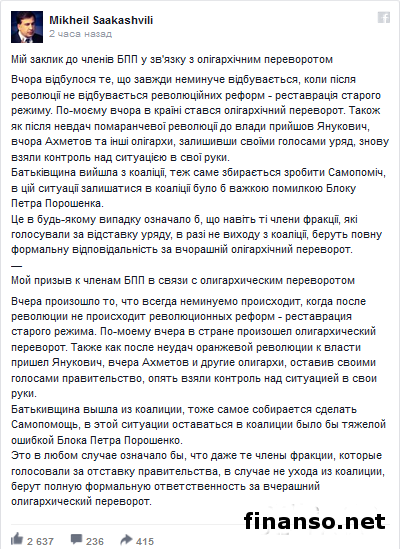 Председатель Одесской областной государственной администрации Михаил Саакашвили призвал фракцию «Блок Петра Порошенко» покинуть коалицию.Как передают корреспонденты издания «Украина сегодня: Finanso.net», Михаил Саакашвили написал на своей странице в социальной сети «Фейсбук», что в Украине состоялась реставрация старого режима. Согласно мнению чиновника, это неизбежно всегда происходит после того, как по завершении революции не осуществляются революционные реформы. Так, Саакашвили написал: «Как мне кажется, вчера в Украине произошел олигархический переворот. Также после неудач оранжевой революции Виктор Янукович пришел к власти. А вчера Ахметов и некоторые другие олигархи, оставив своими голосами Кабинет министров при исполнении, в очередной раз взяли контроль над ситуацией в Украине в свои руки». Председатель Одесской областной государственной администрации Михаил Саакашвили считает, что для фракции БПП будет огромной ошибкой оставаться в коалиции, ведь из нее уже вышла «Батькивщина» и также планирует выйти «Самопомич». Он также подытожил: «Это в любом случае означало бы, что даже члены фракции, которые голосовали за отставку правительства, в случае невыхода из коалиции, берут на себя полную формальную ответственность за вчерашний олигархический переворот». Тимошенко о выходе «Батькивщины» из коалиции.Напомним, ранее издание сообщало, что лидер политической фракции «Батькивщина» Юлия Тимошенко во время брифинга заявила, что ее политическая сила вышла из коалиции в Верховной Раде Украины. При этом Юлия Тимошенко призвала парламентариев воздерживаться от революционных действий в Украине. Как известно, решение о выходе фракции «Батькивщина» из коалиции депутаты политической силы приняли в среду утром, 17 февраля, во время заседания. |