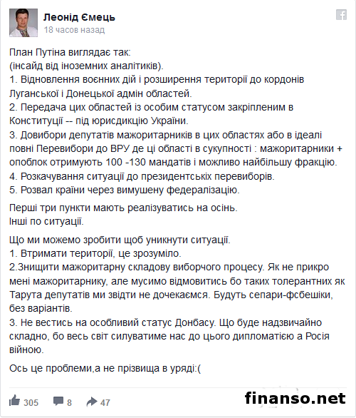 Как передают корреспонденты издания «Украина сегодня: Finanso.net», депутат из фракции «Народный фронт» Леонид Емец на своей странице в социальной сети «Фейсбук» опубликовал информацию со ссылкой на «иностранных аналитиков», которая содержит возможные планы Российской Федерации. Так, политик написал: «План Владимира Путина, лидера страны-агрессора, выглядит так: первым пунктом является восстановление военных действий и расширение территории к границам Донецкой и Луганской административных областей. На втором месте находится передача этих регионов с особым статусом, закрепленным в Конституции, под юрисдикцию Украины. На третьем месте плана Путина располагается пункт, целью которого являются довыборы депутатов-мажоритарщиков в этих областях или же в идеале полные перевыборы в украинском парламенте, где в совокупности мажоритарщики из этих областей вместе с Оппблоком получают 100-130 мандатов и, возможно, наибольшую фракцию. Потом далее, по плану Путина, должно быть раскачивание ситуации до перевыборов президента. И в итоге его плана, из-за вынужденной федерализации будет развал Украины». Часть плана Путина может быть реализована уже осенью.При этом Емец считает, что в случае, если власти Украинского государства не примут вовремя меры, то первые три пункта плана Путина «могут быть реализованы уже к осени текущего года, а остальные два – по ситуации». В соответствии с мнением депутата, чтобы сорвать планы Российской Федерации, Украине необходимо «удержать территории», отказаться от идей предоставления особого статуса отдельным районам Донбасса, а также «уничтожить мажоритарную составляющую избирательного процесса». Также он добавил: «Как ни прискорбно мне, мажоритарщику, однако нужно отказаться, потому что таких толерантных, как Тарута, депутатов мы не дождемся оттуда. Без вариантов, будут сепары-фсбшники». |