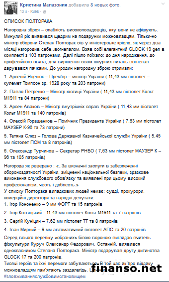 Председатель оборонного ведомства Украины Степан Полторак наградил огнестрельным оружием главу Кабинета министров Арсения Яценюка, а также еще нескольких министров, секретаря СНБО и некоторых народных депутатов Верховной Рады Украины.Как передают корреспонденты издания «Украина сегодня: Finanso.net», соответствующие выдержки из приказа Министерства обороны в социальной сети «Фейсбук» на своей странице опубликовала журналист Кристина Малазония. В сообщении отмечается: «В списке Степана Полторака нет случайных людей: прокуроры, судьи, народные депутаты и коммерческие директора». За что был награжден Яценюк?В том числе сообщается, в мае месяце минувшего года Степан Полторак «за выдающиеся заслуги в обеспечении обороноспособности страны, проявленные высокий профессионализм, доблесть и честь, образцовое выполнение служебного долга, а также укреплении нацбезопасности» наградил оружием главу правительства Арсения Яценюка. Как известно, премьер-министру достались 11,43-миллиметровый пистолет – пулемет Томпсон образца 1928 года и 203 патрона. Кто еще удостоился награды?В это же время в сообщении журналиста говорится, что Кольты М1911, и 84 и 140 патронов в качестве наградного оружия получили соответственно министр юстиции Павел Петренко и глава Министерства внутренних дел Арсен Аваков. В свою очередь, секретарь Совета национальной безопасности и обороны Украины Александр Турчинов получил пистолет Маузер К 7,63 миллиметра и 96 и 105 патронов. Кроме того, награды от министра обороны удостоился и народный депутат Украины, соратник главы государства Игорь Кононенко, который получил в подарок 9-миллиметровый ФОРТ 21.02. и 15 патронов. В сообщении также говорится: «В перечне «избранных» белой вороной оказался учитель физкультуры Куруч Александр Федорович, который является одноклассником Степана Полторака. Глава Минобороны подарил другу детства GLOCK 17 и 200 патронов». |