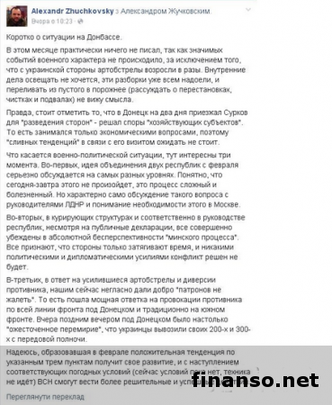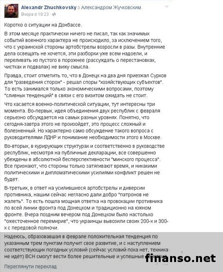 Помощник президента России Владимира Путина Владислав Сурков приезжал в оккупированный пророссийскими боевиками Донецк, чтобы «примирить» разные центры власти в «республике». Как передают корреспонденты издания «Украина сегодня: Finanso.net», на своей странице в социальной сети «Фейсбук» известный «ополченец» и ветеран «обороны Славянска» Александр Жучковский сообщил, что помощник президента РФ Владислав Сурков приезжал в Донецк, чтобы развести в стороны конфликтующие власти в «республике». Так, Жучковский написал: «Решал споры «хозяйствующих субъектов». То есть занимался исключительно экономическими вопросами, в результате «сливных тенденций» в связи с его визитом ожидать не стоит». Военно-политическая ситуация в ДНР.Также Жучковский рассказал об общей военно-политической ситуации в самопровозглашенной Донецкой народной республике. Согласно его сообщению, тут интересны три момента: во-первых, в соглашения, достигнутые в Минске, даже на уровне «кураторов» уже никто не верит; во-вторых, из-за обострения ситуации на Донбассе сепаратистам отдали негласный приказ «патронов не жалеть»; в-третьих, с февраля месяца 2016 года идет серьезное обсуждение на самых разных уровнях идеи объединения двух «республик». «Ополченец» заявил, что особенно на этом настаивает Кремль. Кроме того, Жучковский добавил: «Все признают, что стороны только затягивают время, и никакими дипломатическими и политическими усилиями конфликт решаться не будет». Напомним, ранее руководитель аппарата главы Службы безопасности Украины Александр Ткачук сообщал, что 16 февраля 2016 года в Донецке с визитом находился помощник Владимира Путина Владислав Сурков. Сообщалось, что посещение московским гостем Донбасса было связано с подготовкой к местным выборам на оккупированной части востока Украины, ознакомлением на месте с ситуацией в регионе, а также возможными кадровыми перестановками в «органах власти» ДНР. |