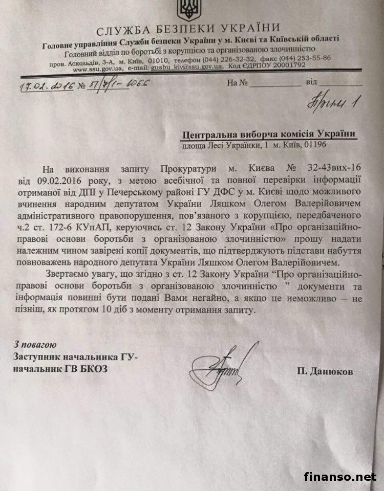 Согласно документу, проверка проводится по информации от Печерской налоговой инспекции о возможном совершении Ляшко админнарушения, связанного с коррупцией. Силовики, в частности, обратились к Центризбиркому за информацией об основаниях получения О. Ляшко полномочий народного депутата. В документе говорится, что проверка проводится во исполнение сделанного запроса от 09.02.2016 г. с полной и всесторонней проверкой информации, полученной ГНИ в Печерском районе ГУ ГФС в г. Киеве о возможном совершении народным депутатом Украины Олегом Валерьевичем админправонарушения, связанного с коррупцией. Спецслужба также просит у ЦИК представить заверенные копии документов, подтверждающие основания приобретения Ляшко О. В. полномочий народного депутата Украины. Ляшко заявил, что СБУ выполняет политический заказ.Ляшко прокомментировал эту ситуацию на своей странице в соцсети, написав, что вместо того чтобы ловить предателей и шпионов, Служба безопасности выполняет политические заказы. «Поскольку коррупция во власти успешно преодолена, теперь меня хотят сделать коррупционером», - подчеркнул парламентарий. Напомним, в январе текущего года руководитель фракции Бориспольской районной организации «Радикальной партии» (лидер – О. Ляшко), являющийся секретарем комиссии по вопросам законности, правопорядка районного совета был задержан при получении части взятки в размере 15 тыс. гривен. Об этом сообщила пресс-служба прокуратуры Киевской области. Названный депутат организовал, чтобы ему руководители одного из предприятий ежемесячно платили 15 тысяч гривен за нереагирование на нарушения охраны природного законодательства. Злоумышленник в общем уже получил 30 тысяч таких выплат. Правоохранителями было открыто уголовное производство, мужчине грозит до 8 лет лишения свободы с конфискацией имущества. Решался вопрос о его задержании. Правоохранителями устанавливались обстоятельства совершенного преступления. |