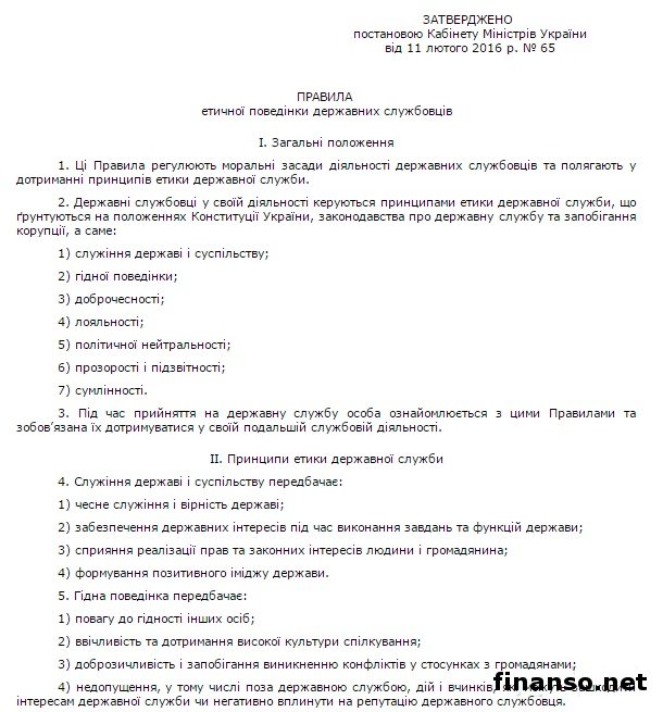 Правительство Украины требует от госслужащих воздерживаться от публичной критики органов государственной власти, а также должностных лиц, о чем говорится в постановлении Кабинета министров «Об утверждении Правил этического поведения государственных служащих» от 11 февраля (№65), обнародованном на правительственном портале 1 марта 2016 года.