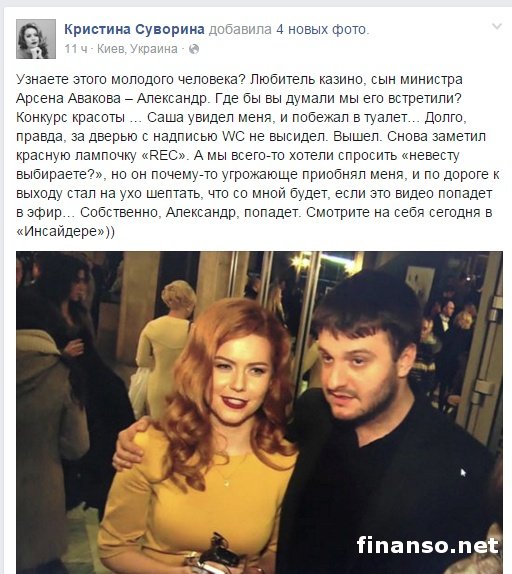 Опубликовав соответствующее фото Суворина написала, что любителя казино и сына главы МВД Арсена Авакова увидели на конкурсе красоты. Увидев журналистку он побежал в туалет, но за дверью в надписью WC долго не высидел и вышел. А мы всего-то хотели спросить «невесту выбираете?». Заметив красную лампочку «REC», рассказала Суворина, он по дороге к выходу приобнял ее и стал шептать на ухо, что с ней будет, если это видео попадет в эфир. «Оно обязательно попадет», - написала Суворина. Комментируя этот инцидент, парламентарий Сергей Лещенко написал на своей странице в «Фейсбуке», что тот самый сын Авакова, договаривавшийся о рюкзаках в кабинете заместителя папы-министра, теперь угрожает журналистам. После эти рюкзаки поставляла фирма с признаками фиктивности. Это тот самый сын Авакова, которого сняли на видео в подпольном казино. Деятельность игорного заведения должно предотвращать возглавляемое его отцом министерство. Это действительно происходит в Украине.«Вы не ошиблись, и это действительно происходит в Украине, прошедшей через смерти Майдана», - подчеркнул С. Лещенко. Продюсер Александр Ягольник в своем «Фейсбуке» вопрошает: «Неужели папа по-прежнему не хочет взять ремень? Или поговорить хотя бы по-мужски?» На инцидент реагирует в «Фейсбуке» и блогер Дмитрий Филлимонов: «Пани Суворина молодец!» Журналист Роман Бочкала написал на своей странице в соцсети «Фейсбук», что «они не дадут в обиду Кристину, и этот ублюдок допрыгается». По его словам, он переплюнул младшего Ющенко с его БМВ и яхтами. Но тогда был мир, а сейчас война. Сейчас этот на армейских рюкзаках мутит, в казино деньгами сорит, журналистам угрожает. Роман Бочкала подчеркивает: «Говорят, сын за отца не отвечает. В данном случае все наоборот. Яблоко от яблони. Однозначно имеются признаки правонарушения ст. 171 украинского УК». «Однако что-то подсказывает: МВД дело не возбудит. Пока папа там министр», - резюмирует журналист. |
