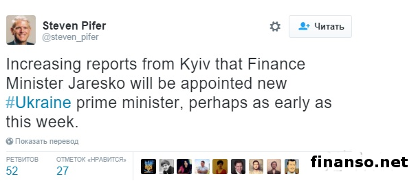Стивен Пайфер, являющийся бывшим послом Соединенных Штатов Америки в Украине, заявил, что действующего главу Кабинета министров Украины Арсения Яценюка, вероятней всего, сменит председатель Министерства финансов Наталия Яресько.