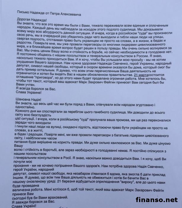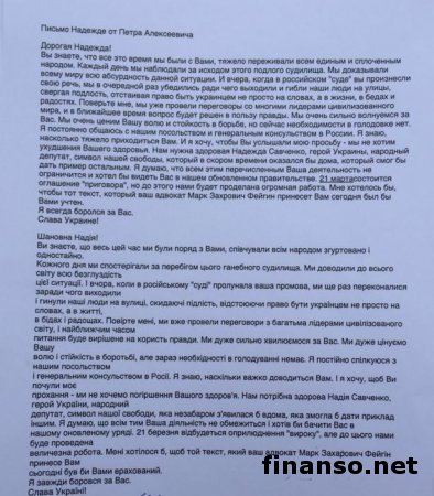 Удерживаемая в СИЗО в Ростовской области РФ украинская летчица и парламентарий Надежда Савченко прекратила сухую голодовку. Об этом сообщил в своем блоге в соцсети «Твиттер» украинский парламентарий Иван Крулько со ссылкой на адвоката украинки Марка Фейгина. Этими событиями интересовались корреспонденты издания «Украина сегодня: Finanso.net». И. Крулько написал, что Надежда прекратила сухую голодовку. Только что об этом сообщил адвокат Марк Фейгин. «Надежда выбрала жизнь и борьбу», - сообщил парламентарий. Украинский парламентарий сейчас находится под зданием СИЗО. Свое решение перейти на воду и детские смеси Савченко приняла после того, как получила письмо от украинского президента, который обещал сделать все возможное, чтобы обменять пленную. В своем обращении к украинцам, обнародованном сегодня на странице лидера «Батькивщины» Юлии Тимошенко в соцсети «Фейсбук», Н. Савченко говорит, что она «никогда не признает ни российского суда, ни своей вины». Савченко написала, что получила слова поддержки от президента Украины.Она также написала, что получила слова поддержки от главы Украины Петра Алексеевича Порошенко. По ее словам, она знает, что много людей прилагают все усилия для ее освобождения, и она всем благодарна за это. Савченко подчеркнула в письме, что жизнь одного человека не стоит двух, поэтому обмен будет либо всех на всех, либо души на душу: «Моя жизнь уже точно не стоит того, чтобы сдавать врагу землю Украины, оккупированный Крым и Донбасс. До приговора я сменю сухую голодовку на голодовку на воде». Савченко также написала, что суд прислушался к ее требованиям и взял неделю на вынесение приговора (7 рабочих дней). «Это еще одна победа в нашем бою», - заявила она. Донецкий горсуд Ростовской области РФ вынесет приговор Н. Савченко 21 и 22 марта. Адвокат Марк Фейгин обнародовал письмо президента Украины летчице. Глава государства написал, что хотел бы видеть Савченко в обновленном правительстве. Глава Украины Петр Порошенко 9 марта заявил о готовности обменять Н. Савченко, если поступит соответствующее предложение. На совместной пресс-конференции с президентом Турции Реджепом Тайипом Эрдоганом в Анкаре П. Порошенко заявил, что, как президент Украины, он готов воспользоваться конституционным правом и обменять Надежду, сделав все возможное, чтобы вернуть ее домой. |