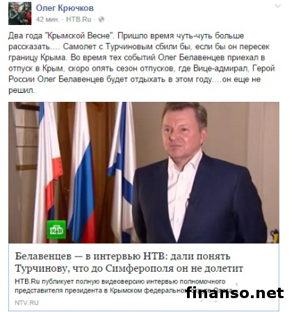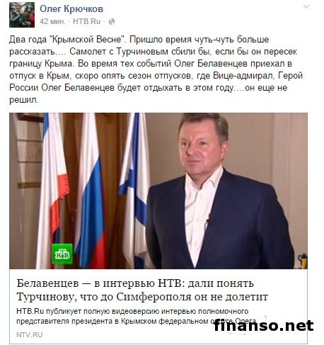 «Полномочный представитель» президента России Владимира Путина в Крыму Олег Белавенцев в интервью НТВ сообщил, что во время вооруженного захвата украинского Крыма весной 2014 года на полуострове готовились сбивать самолет тогдашнего спикера Верховной Рады Украины Александра Турчинова.Как удалось выяснить корреспондентам издания «Украина сегодня: Finanso.net», согласно словам Белавенцева, «Александр Турчинов лично развязывал гражданскую войну в Крыму». Он также уточняет, что тогдашний спикер Рады направлял на полуостров эмиссаров, которые всячески пытались склонить руководителей Крыма, в том числе и председателя Верховного совета, к неисполнению своих обязанностей, а депутатам якобы рассылали СМС с угрозами. В это же время Белавенцев также отметил, что Александр Турчинов собирался лично лететь в Крым со своим спецназом, однако ему дали понять, что до Симферополя он не долетит точно. Белавенцев подчеркнул: «Он собирался двумя бортами вылететь сюда: на одном он должен бы быть сам, на другом – подготовленная группа специального назначения. Но дело в том, что мы тут принимали решение, нам никто не мешал. Сообщили: если пересечет границу – мы собьем самолет с ним». Оккупация Крыма.Насколько известно, 20 февраля 2014 года был объявлен началом временной оккупации Россией Крымского полуострова и Севастополя. Спикер Верховной Рады Украины Александр Турчинов был избран исполняющим обязанности президента Украины до установления результатов перевыборов президента в мае месяце 2014 года. На территории Крыма и в городе Севастополе, 16 марта 2014 года был проведен псевдореферендум относительно статуса полуострова, по результатам которого Россия включила Крым в свой состав. Напомним также, что договор о «присоединении Крыма и Севастополя к России в качестве субъектов федерации» был подписан 18 марта 2014 года. |