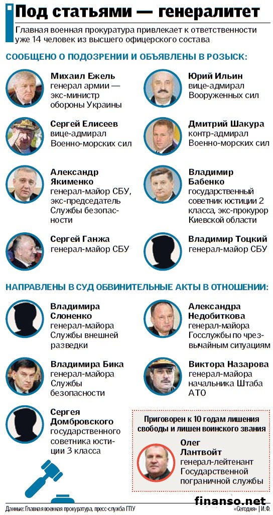 Матиос сообщил, что объявлены в розыск бывшие министры обороны - Лебедев и Ежель. В числе таких лиц также экс-начальник Генштаба, главнокомандующий ВСУ Ильин, заявил он. Адмирал запас Ежель, по словам Матиоса, длительное время находится в одном из лечебных учреждений белорусского Минобороны. Главный военный прокурор подчеркнул, что нашей стороной не проводятся диверсионные операции на территории других государств, к примеру, как это делает спецслужба «Моссад», поскольку это не предусмотрено украинским законом. По его словам, если Ежель находится на территории другого государства и, судя из официальных сообщений, болеет, у нас по закону нет другого выхода, как ожидать, когда он выздоровеет. «Выехать и проверить этот факт в Беларуси у нас также нет возможности», - сообщил Матиос. Ежель обвиняется в халатности.По вопросу предъявляемого Ежелю обвинения Матиос рассказал, что в сообщении о подозрении указано на ненадлежащее выполнение им служебных обязанностей при согласовании в 2011 г. перечня имущества ВСУ, подлежавшего отчуждению. «Решение бывшего главы оборонного ведомства тогда произвело к неправомерному отчуждению стратегических бомбардировщиков Ту-95МС субъекту предпринимательства, что принесло государству материальный ущерб на сумму более 24 млн. грн.», - заявил главный военный прокурор. По словам Матиоса, в ходе досудебного расследования было установлено местонахождение самолетов, комплектующих к ним, наложен арест и предотвращена их дальнейшая реализация в РФ. В ходе интервью Матиос также сообщил о находящихся в розыске других бывших украинских военачальниках . Экс-глава Генштаба, главнокомандующий ВСУ адмирал Ильин разыскивается за участие в преступной организации и дезертирство. «Бывшие командующий украинским ВМФ контр-адмирал Березовский, замкомандующего контр-адмирал Шакуров и вице-адмирал Елисеев обвиняются в дезертирстве и госизмене», - сообщил главный военный прокурор. |