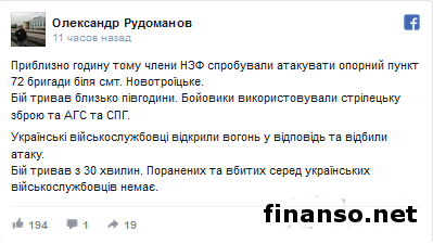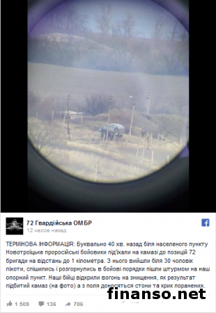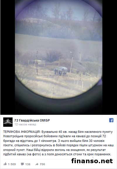 Как удалось выяснить корреспондентам издания «Украина сегодня: Finanso.net», боестолкновение между конфликтующими сторонами имело место в 18 часов 00 минут среды, 23 марта. В сообщении сказано: «Пророссийские террористы подъехали на автомобиле КамАз к позициям 72-й бригады на расстояние до 1 километра. Из транспортного средства вышли порядка тридцати боевиков пехоты и пошли штурмом на опорный пункт сил АТО». При этом в 72-й ОМБр добавили: «Наши бойцы открыли огонь на поражение, в результате чего был подбит вражеский КамАз, а с поля боя доносятся крики и стоны раненых». В свою очередь, журналист Александр Рудоманов добавил, что бой между силами антитеррористической операции и боевиками продолжался порядка тридцати минут. В своем «Фейсбук» Рудоманов написал: «Террористы использовали стрелковое оружие, автоматический гранатомет станковый (АГС) и станковый противотанковый гранатомет (СПГ)». Он отметил: «Силы антитеррористической операции открыли огонь и отбили атаку. Среди украинских военнослужащих раненых и погибших в результате боя под Новотроицким нет». ![]() Боевики сконцентрировались на Донецком направлении.В свою очередь, в пресс-центре штаба антитеррористической операции на своей странице в «Фейсбуке» сообщили, что террористы продолжают нарушать условия перемирия и вести огонь по позициям сил АТО из запрещенного соглашениями, достигнутыми в Минске, оружия. В сообщении говорится: «В общей мере за минувшие сутки враг совершил 53 обстрела позиций Вооруженных сил Украины. Больше всего их было зафиксировано на Донецком направлении, а именно 48». |