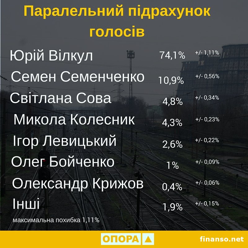 Согласно официальным данным временного избиркома на местных выборах в мэры Кривого Рога, была зафиксирована победа Юрия Вилкула. Об этом сообщил председатель избирательной комиссии Кривого Рога Павел Гивель, сообщают украинские масс-медиа. Как удалось выяснить корреспондентам издания «Украина сегодня: Finanso.net», действующий городской голова получил, по предварительным данным, 74,18 процента голосов избирателей, принявших участие в голосовании. Таким образом, Юрий Вилкул остается на своем посту мэра Кривого Рога. По информации гортеризбиркома, его ближайший оппонент Семен Семенченко получил 10,92 процента голосов. На третьем месте Светлана Сова, за которую проголосовало 4,67 процента, а завершает четверку лидеров Николай Колесник, у которого 4.36 процента голосов. Все остальные претенденты, согласно этих данным, набрали менее трех процентов голосов. Ю. Вилкул выиграл выборы городского главы Кривого Рога в первом туре.Также, по данным наблюдателей в Сети, Юрий Вилкул выиграл выборы в первом туре, набрав от 73 до 75.2 процента голосов избирателей. По этим данным, на втором месте кандидат от «Самопомощи» Семен Семенченко, у которого от 10,4 до 11.5 процента. На третьем месте по этим подсчетам кандидат от партии «Сила людей» Светлана Сова, набравшая от 4,4 процента до 5,1 процента голосов избирателей, пришедших на выборы городского головы. Свои данные по итогам параллельного подсчета голосов, отраженных в таблице, также представила гражданская Всеукраинская сеть общественных активистов «Опора». Отметим также, по данным экзит-полла Research and Branding Group, на этих выборах первое место занял Юрий Вилкул, набравший 70,9 процента голосов. Семен Семенченко с 11.3 процента проголосовавших за него находится на втором месте. На третьем месте – Николай Колесник, набравший 6,7 процента голосов. Параллельный подсчет штаба Вилкула, как сообщалось, также установил его победу. Напомним, в Кривом Роге 27 марта состоялись повторные выборы городского головы. Результаты параллельного подсчета голосов показали, что победу на них получил нынешний мэр города Юрий Вилкул, основным конкурентом которого был представитель партии «Самопомощь», парламентарий Семен Семенченко. |
