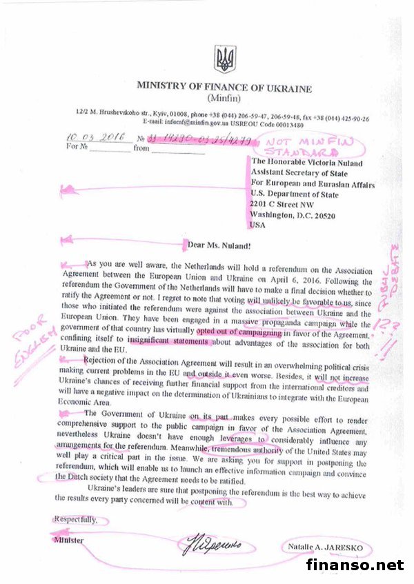 Как удалось выяснить корреспондентам издания «Украина сегодня: Finanso.net», по словам Яресько, Рунетом гуляет плохо подделанное письмо Минфина к США с просьбой помочь отложить референдум в Нидерландах относительно Соглашения об ассоциации между ЕС и Украиной. Она прикрепила скан этого письма, на котором видны ее отметки и комментарии, написанные от руки. Критикуется, в частности, несоответствие стандартов оформления этого документа тем, которые существуют в финведомстве, а также «плохой английский». В этом письме глава украинского финведомства якобы выражала сомнение в позитивных для Украины результатах на референдуме. Проблемы как у ЕС, так и за его границами, как следствие, ухудшаться. В фейке утверждается, кроме того, что в результате «шансы Украины на получение финпомощи от международных кредиторов не увеличатся». Напомним, что в июле прошлого года парламент Нидерландов завершил процедуру ратификации Соглашения об ассоциации между Украиной и ЕС. Консультативный референдум в Нидерландах состоится 6 апреля.Вместе с тем спустя два месяца в Нидерландах было собрано необходимое число подписей (более 450 тыс.) для проведения консультативного референдума о ратификации соглашения. Он был назначен на 6 апреля. Если на референдум явятся не менее 30 процентов голландских граждан, и они проголосуют за пересмотр соглашения с Украиной, то парламентом и правительством такое решение может быть принято к рассмотрению. В то же время, как сообщается, названный референдум обязательным к выполнению не является, став только реальной оценкой мнения граждан страны. В Интернете в преддверии этого референдума уже распространили несколько фейков, направленных на очернение имиджа Украины в Европе. Оппоненты нашей страны, в частности, распространяют тезис, что речь идет не Соглашении об ассоциации, а о членстве Украины в ЕС. Direct Research 20 марта обнародовала результаты соцопроса. Согласно этим данным, «за» ратификацию соглашения проголосуют 13,8 процента, скорее всего, «за» будут 21,2 процента. В то же время «точно против» проголосуют 14,9 процента, а «против», скорее всего, будут голосовать 20,8 процента. К тому моменту 29 процентов респондентов еще не определились по голосованию. |