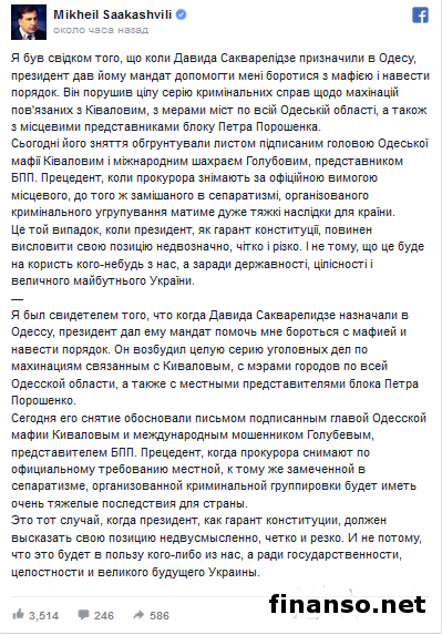 Увольнение Давида Сакварелидзе с должности замгенпрокурора Украины – прокурора Одесской области было осуществлено по требованию одесской преступной группировки, замеченной в сепаратизме. Об этом заявил на своей странице в соцсети «Фейсбук» глава Одесской ОГА Михаил Саакашвили. Как удалось выяснить корреспондентам издания «Украина сегодня: Finanso.net», по словам губернатора Одессчины, его сегодняшнее снятие объяснили письмом, подписанным руководителем Одесской мафии Киваловым (внефракционный парламентарий) и международным жуликом Голубевым, представителем БПП (парламентарием от БПП Д. Голубевым). М.Саакашвили назвал прецедентом, когда прокурора снимают по официальному требованию местной власти, к тому же замеченной в сепаратизме, организации преступной группировки и считает, что это будет иметь тяжелые последствия для страны. Глава Украины Петр Порошенко, как ожидает глава облгосадминистрации, должен высказать по этому поводу свою позицию. Президент Украины должен высказать по этому поводу свою четкую позицию.По заявлению М. Саакашвили, это тот случай, когда глава государства как гарант Конституции должен высказать свою позицию не двусмысленно, а четко и резко. «Это должно быть сделано не потому, что оно будет в пользу кого-нибудь из нас, а ради государственности, целостности и большого будущего Украины», - написал он. Глава ОГА подчеркнул, что когда Д. Сакварелидзе назначали прокурором Одесской области, глава Украины дал ему мандат «помочь руководителю облгосадминистрации бороться с мафией и навести порядок». По словам М. Саакашвили, приступив к работе, Сакварелидзе возбудил целую серию уголовных дел в отношении махинаций, связанных с Киваловым, с мэрами городов по всей Одесской области, а также с местными представителями БПП. Как это уже сообщалось, сегодня утром замгенпрокурора Украины Давид Сакварелидзе был уволен из органов прокуратуры в связи с привлечением к дисциплинарной ответственности и сокращением его должности. Чуть ранее, 26 марта текущего года, группа парламентариев от Одесской области поддержала обращение руководителей территориальных прокуратур об увольнении Д. Сакварелидзе с занимаемой должности и вообще из органов прокуратуры. По мнению самого Д. Сакварелидзе, он связывает давление на него в связи с расследованием так называемого дела бриллиантовых прокуроров. В ГПУ обвинения Д. Сакварелидзе называют популистскими и безосновательными, сообщив, что в ведомство реформируется и всем сотрудникам, получившим предупреждения об увольнении, предлагаются вакантные должности в ГПУ. |