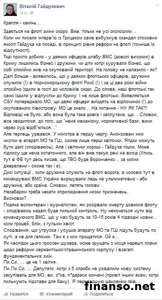 В последнее время вокруг командующего Военно-морскими силами страны вице-адмирала Сергея Гайдука разгорелось несколько скандалов. Вероятно, в результате таких событий Верховный главнокомандующий Вооруженных сил Украины, украинский лидер Петр Порошенко уволил главу ВМС, о чем пишет «Думская», ссылаясь на собственные источники в Генеральном штабе ВСУ. Деятельность Сергея Гайдука во главе флота Украины, по информации источников, неоднократно подвергалась критике. В итоге командующий ВМС был уволен. Как удалось выяснить «Украина сегодня: Finanso.net», на посту главы Военно-морских сил его заменил участник антитеррористической операции, экс-заместитель по береговой охране генерал-лейтенант Игорь Воронченко. Что известно о новоназначенном командующем ВМС?Удалось выяснить, что новоназначенный командующий ВМС Украины Игорь Воронченко пользуется авторитетом среди подчиненных. Примечательно, что он проявил себя с лучшей стороны во время оккупации Крымского полуострова Россией, а также принимая участие в боевых действиях против страны-агрессора на украинском Донбассе. В сообщении издания говорится: «Участник антитеррористической операции Игорь Воронченко занимает значимую позицию, так сказать, имеет авторитет среди подчиненных. Отмечается, что во время оккупации Крымского полуострова Россией он проявил себя с самой лучшей стороны. Аналогично он проявил себя и на фронте». Источники издания при этом подчеркнули, что официальное представление командира флота состоится в Одессе в субботу, 2 апреля, на борту флагманского фрегата «Гетман Сагайдачный». Также выяснилось и то, что во время появления «зеленых человечков» в Крыму Воронченко занимал пост заместителя командующего флотом по береговой охране. Немного позже после этого генерал принял командование силами антитеррористической операции в Луганской области. Последняя должность, которую он занимал перед назначением командующим ВМС Украины, была начальник Главного управления персонала Генерального штаба ВСУ. Информацию об увольнении командующего ВМС Украины вице-адмирала Сергея Гайдука в своем аккаунте в социальной сети «Фейсбук» также сообщил и журналист Виталий Гайдукевич. |