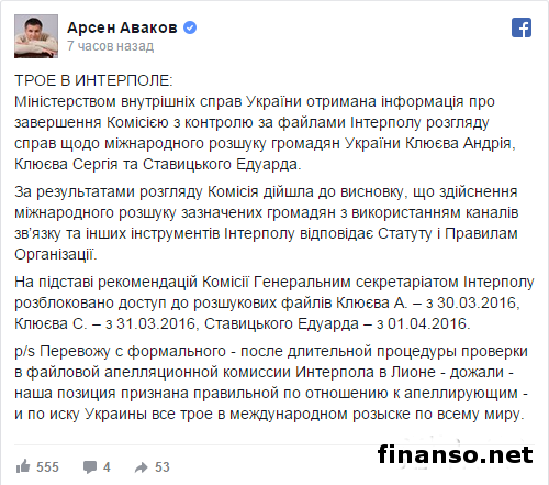 Как сообщил в своем аккаунте в соцсети Facebook председатель Министерства внутренних дел Арсен Аваков, к такому выводу пришла Комиссия по контролю за файлами Интерпола. Корреспонденты «Украина сегодня: Finanso.net» выяснили, что в сообщении главы МВД Украины говорится: «Информация о завершении Комиссии по контролю за файлами Интерпола рассмотрения дел относительно международного розыска украинских граждан Эдуарда Ставицкого, Андрея и Сергея Клюевых поступила в Министерство внутренних дел Украины. Комиссия по результатам рассмотрения пришла к выводу, что осуществление международного розыска вышеуказанных лиц с использованием каналов связи и других инструментов Интерпола соответствует Правилам Организации и ее Уставу». В сообщении Арсена Авакова подчеркивается, что после такого решения Комиссии, доступ к розыскным файлам Эдуарда Ставицкого был разблокирован с 1 марта 2016 года, Андрея Клюева с 30 марта текущего года, а его брата Сергея – с 31 марта 2016-го. Дела «регионалов».Напомним, ранее издание уже сообщало, что одно из уголовных дел в отношении бывшего лидера Партии регионов Александра Ефремова было закрыто сотрудниками ГПУ. По словам советника министра внутренних дел Арсена Авакова Зоряна Шкиряка, Генеральная прокуратура Украины «закрыла дело» и даже вернула Александру Ефремову залог. В свою очередь, прокурор Генеральной прокуратуры Украины Владислав Куценко прокомментировал этот случай таким образом, что в отношении бывшего главы ПР А. Ефремова было закрыто всего лишь одно уголовное дело, связанное с «разжиганием национальной ненависти». Также ранее издание «Украина сегодня: Finanso.net» сообщало, что суд отменил розыск бывшего народного депутата от Партии регионов Юрия Иванющенко, который в стране хорошо известен как Юрий Енакиевский. Сообщалось, что такое решение принял одиозный судья Днестровского района суда Киева Николай Чаус. Он же отменил и санкцию на доставку экс-депутата Партии регионов под стражей для избрания меры пресечения. |