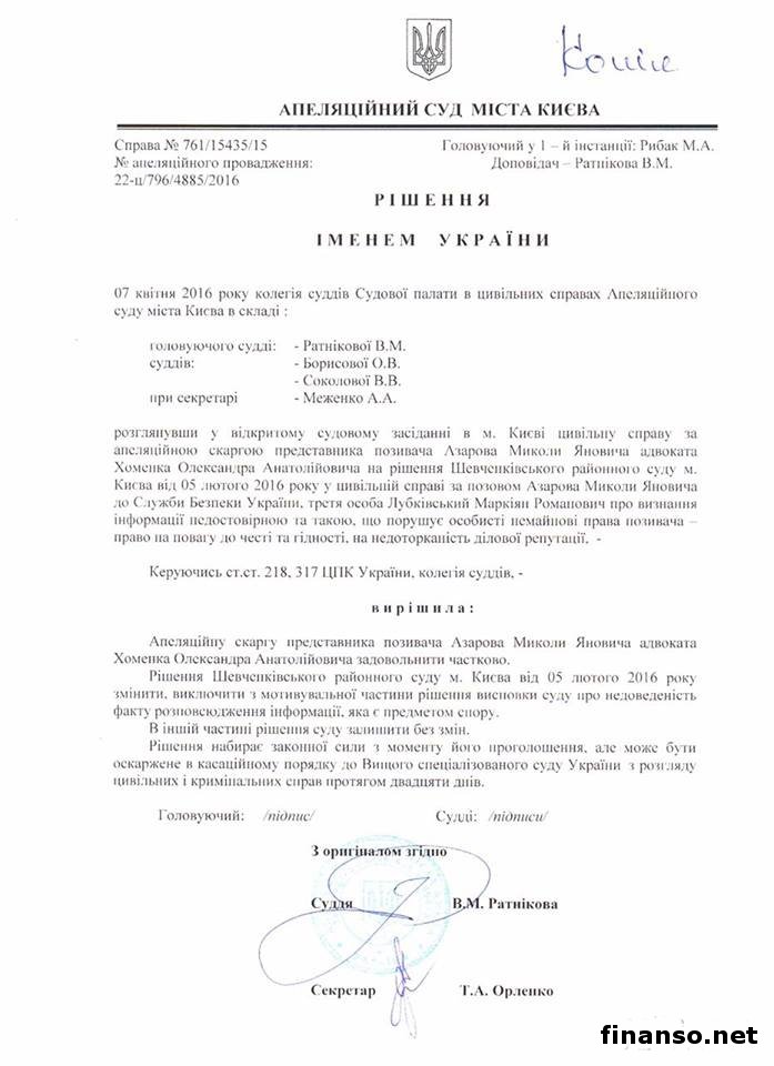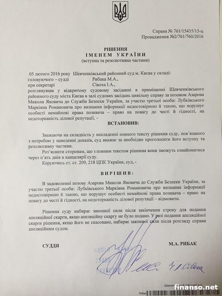 Экс-премьер-министр Николай Азаров проиграл суд и апелляцию по своему иску против бывшего советника главы украинской Службы безопасности Маркияна Лубкивского, которого он обвинял в клевете. Об этом М. Лубкивский сообщил на своей странице в соцсети «Фейсбук».