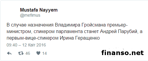Президентская парламентская фракция «Блок Петра Порошенко» выдвинула на должность первого вице-спикера Верховной Рады Украины Ирину Геращенко.Народный депутат Верховной Рады Украины от фракции «Блок Петра Порошенко» заявил, что в случае, если действующий спикер ВРУ Владимир Гройсман возглавит новый состав правительства, то должность председателя украинского парламента займет нынешний первый вице-спикер Андрей Парубий, а на пост вице-спикера будет назначена парламентарий из президентской фракции Ирина Геращенко. Как удалось выяснить корреспондентам «Украина сегодня: Finanso.net», в своем «Твиттере» депутат Мустафа Найем написал: «В случае если Владимир Гройсман станет премьер-министром Украины, спикером ВРУ будет назначен Андрей Парубий, а первым вице-спикером может стать Ирина Геращенко». В свою очередь, еще один депутат от БПП Сергей Лещенко также подтвердил такие данные, сообщив, что такое решение было принято во время заседания фракции, которое началось во вторник утром, 12 апреля. Также, по словам Сергея Лещенко, на заседание фракции должен прибыть и президент Украины Петр Порошенко. Нардеп отметил, что должность вице-спикера будет вакантной только после того, как Андрей Парубий будет назначен спикером украинского парламента. В свою очередь, сама Ирина Геращенко пока что никак не комментирует возможное ее назначение на указанную должность. Как известно, Ирина Геращенко в настоящее время является представителем Украины в политической подгруппе Трехсторонней контактной группы по мирному урегулированию конфликта на Востоке Украины. Формирование Кабмина.Напомним, ранее сегодня издание уже сообщало, что переговоры по согласованию нового состава Кабмина, которые проходили в Администрации президента, завершились. Как сообщил в своем микроблоге в соцсети «Твиттер» пресс-секретарь руководителя украинского парламента Дмитрий Столярчук, «практически все позиции по формированию Кабинета министров уже согласованы. Гройсману удалось отстоять реформаторское ядро в новом правительстве». |