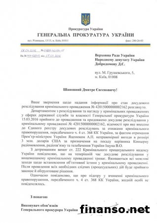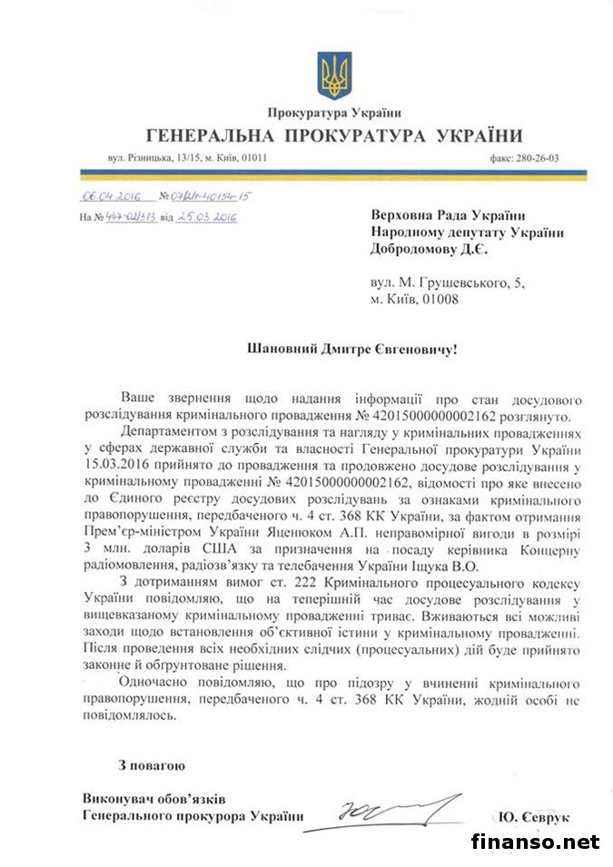 Как удалось выяснить корреспондентам издания «Украина сегодня: Finanso.net», информация была предоставлена в ответ на запрос парламентария Дмитрия Добродомова. Сообщается, что уголовное производство в было открыто 15 марта текущего года и зарегистрировано. В настоящее время расследование продолжается. По предоставленной по запросу нардепа информации, департамент Генпрокуратуры по расследованию и надзору в уголовных производствах в сфере госслужбы и собственности продолжил досудебное расследование по уголовному производству, предусмотренному ч. 4 ст. 368 украинского Уголовного кодекса. Дело было открыто по факту получения главой украинского правительства А. Яценюком неправомерной выгоды в размере 3 млн. долларов за назначение на В. Ищука на должность главы Концерна радиовещания, радиосвязи и телевещания Украины. Начатое досудебное расследование продолжается, подчеркнули в ответе ГПУ. Подозрения по названной уголовной статье ГПУ пока никому не предъявлялись.В то же время в ответе ГПУ за подписью и. о. генпрокурора Юрия Севрука, сообщается, что о подозрении в совершении этого уголовного правонарушения, согласно названной статье УК Украины, никому не предъявлялось. Согласно информации, В. Ищук был назначен Кабмином главой «Концерна РТТ» в июле прошлого года. До этого он занимал должность первого замруководителя названного концерна. Против Ищука, по словам Добродомова, открыто еще несколько уголовных дел. Его, в частности, обвиняют в покупке за средства концерна элитной недвижимости на Печерске и содействию в финансировании сепаратистских каналов. Парламентарий Добродомов пишет, что ГПУ подтвердил сейчас давние подозрения, что одиозным чиновником неслучайно получена должность вне конкурса. Лидер «Народного контроля» отметил, что «Концерн РРТ» относится к стратегически важным предприятиям, выполняющим техобслуживание и эксплуатация сетей эфирного теле- и радиовещания. Добродомов добавил, что концерн практически отвечает за информбезопасность страны, и должность руководителя в нем Яценюк продал человеку, поддерживавшего сепаратистов. «Что это, если не преступление против государства?» - резюмировал парламентарий. Напомним, А. Яценюк был назначен главой украинского правительства 27 февраля 2014 г. О своей отставке А. Яценюк публично заявил 10 апреля, отметив, что «процесс смены правительства превратился в бездумный бег на месте» . |