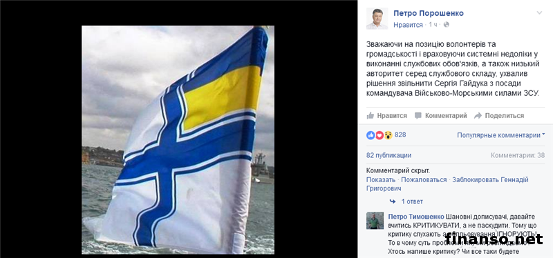 Как удалось выяснить корреспондентам новостного интернет-портала «Украина сегодня: Finanso.net», П. Порошенко принял это решение, учитывая позицию волонтеров и общественности, а также системные недостатки С. Гайдука в выполнении им служебных обязанностей, учтя также низкий авторитет командующего ВМС среди служебного состава. Как известно, накануне был обнародован указ президента Украины об увольнении Сергея Гайдука с должности командующего ВМС Украины. Напомним, что представители волонтерских фондов CombatUA, «Народный проект», «Вернись живым», «Народный тыл» ранее обращались к главе Украины, Военной прокуратуре, СНБО, украинской Службе безопасности и к оборонному ведомству страны с просьбой проверить их сведения о связи верхушки ВМС со страной-агрессором – РФ. Волонтерами сообщалось о кумовстве и коррупции в украинских ВМС.Волонтерами также сообщалось о кумовстве и коррупции в ВМС, они просили провести переаттестацию сотрудников командования. Напомним, что в начале апреля одно из местных одесских изданий, со ссылкой на источники в украинском Генштабе, сообщали, что президент Петр Порошено уволил С. Гайдука, «работа которого во главе украинского военного флота с разных сторон неоднократно критиковалась». По этой информации, тогда новым командующим якобы был назначен участник АТО, генерал-лейтенант Игорь Воронченко. В ВМС ВСУ, в свою очередь, тогда заявили, что С. Гайдука с должности командующего флотом не увольняли. Командующим ВМС С. Гайдук был с 7 марта 2014 г. Следует также напомнить, что глава оборонного ведомства Украины Степан Полторак в конце февраля рассказал, что его министерством проверяется информация о вероятной связи родственников С. Гайдука с российской ФСБ. Глава украинского Минобороны высказывался тогда в ходе своего интервью медиа-изданиям, что, «не проверив действительность соответствующей информации, нельзя очень скоро принимать решение». При этом необходимости отстранять С. Гайдука от своей должности на время расследования, глава Минобороны не видел. |