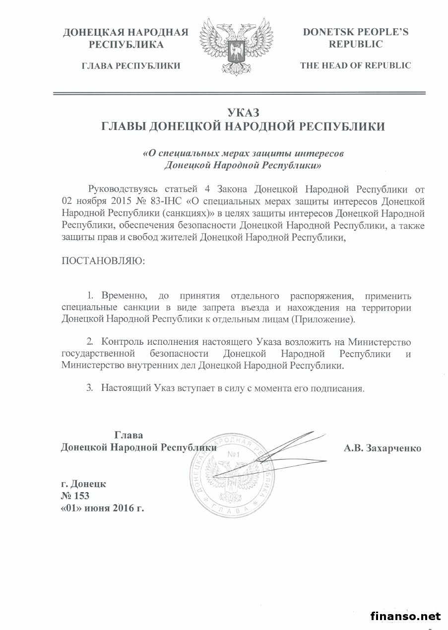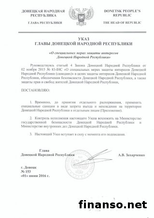 Террористы самопровозглашенной Донецкой народной республики издали свой список, подписанный впоследствии Захарченко, состоявший из тех лиц, которых боевики не желают видеть на территориях оккупированных городов Донецкой области.Как передают корреспонденты издания «Украина сегодня: Finanso.net», главарь террористической организации Донецкая народная республика Александр Захарченко подписал указ «О специальных мерах защиты интересов Донецкой Народной Республики», в котором говорится, что на оккупированную территорию запрещен въезд Ринату Ахметову и еще 48 бизнесменам. Такой вот «Указ» о «Специальных мерах защиты интересов Донецкой Народной Республики» был издан 1 июня 2016 года. Примечательно, что среди персон нон грата ДНР фигурируют бывшие и действующие народные депутаты Верховной Рады Украины и олигархи, в частности Ринат Ахметов, а также некоторые чиновники времен президентства Виктора Януковича, которые в настоящее время пребывают на территории Российской Федерации, скрываясь от правосудия. Стоит отметить, что в списке персон нон грата террористов ДНР не фигурируют имена и фамилии представителей действующей власти в Украине. Список персон нон грата.Так, список людей, которым запрещен въезд на территорию ДНР, состоит из следующих лиц: Курчин Олег Геннадьевич 25 декабря 1975 г., Курченко Сергей Витальевич 21 сентября 1985, Харьков, Тисленко Александр 1968 года рождения, Васильев Геннадий Андреевич 1953 года рождения, Адамов Александр Борисович 1978 года рождения, Адамов Борис Исаевич 17 июня 1951 года, Донецк, Близнюк Анатолий Михайлович 24 ноября 1948 года, Краматорск, Захарченко Виталий Юрьевич 20 января 1963 г., Татьков Виктор Иванович 29 апреля 1956 г., Клименко Александр Иванович 14 апреля 1965 г., Николай Левченко 16 октября 1969 г., Донецк, Владимир Рыбак 3 октября 1946 г., Донецк, Александр Шепелев 4 июля 1970 г., Донецк, Анатолий Близнюк 27 ноября 1948 г., Краматорск, Донецкая обл., Павел Климец 23 июля 1967 г., Донецк, Александр Папаика 25 ноября 1951 г., с. Зеленянка, Донецкая обл., Николай Купянский 13 ноября 1965 г. Константиновка, Донецка обл., Александр Лукьянченко 30 августа 1947 г., хут. Бердычи, Донецкая обл., Владислав Дрегер 1 июня 1974 г., Ринат Ахметов 21 сентября 1966 г. Донецк, Андрей Клюев 12 августа 1964 г., Донецк, Юрий Бойко 9 октября 1958 г., Горловка, Донецкая обл., Борис Колесников 25 октября 1962 г., Мариуполь, Донецкая обл., Сергей Тулуб 13 августа 1953 г., Донецк, Сергей Тарута 23 июля 1955 г., с. Виноградное, Донецкая обл., Виктор Пшонка 6 февраля 1954 г., с. Сергеевка, Донецкая обл., Леонид Юрушев 1 июня 1946 г., Донецкая обл., Станислав Скубашевский 30 мая 1949 г., с. Голенищево, Хмельницкая обл., Раиса Богатырёва 6 января 1953 г., с. Бакал, Челябинская обл., Россия, Александр Медведько 25 июля 1955 г., с. Искровка, Запорожская обл., Владимир Вечерко 7 ноября 1953 г., Славянск, Донецкая обл., Игорь Юшко 21 августа 1967 г., Донецк, Олег Мкртчан 7 вересня 1966, Александр Лещинский 2 марта 1964, Эдуард Прутник 15 января 1973 г., с. Селидово, Донецкая обл., Николай Янковский 12 августа 1944 г., с. Покотилово, Кировоградская обл., Леонид Байсаров 1 июня 1954 г.с. Никитовка, Донецкая обл., Георгий Скударь 18 июля 1942 г., Оловянная, Читинская обл., Россия, Юрий Иванющенко 21 февраля 1959 г., Енакиево, Донецкая обл., Антон Пригодский 17 марта 1950 г., с. Зеленица, Житомирская обл., Валентин Ландык 22 ноября 1946 г., пос. Часов Яр, Донецкая обл., Виталий Гайдук 19 июля 
