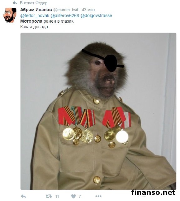 Как удалось выяснить корреспондентам новостного интернет-портала «Украина сегодня: Finanso.net», по информации, боевик получил ранение левого глаза, и его уже забрали в Санкт-Петербург для проведения операции. К. Долгов написал, что «Моторола ранен, осколок повредил левый глаз. Его вывезли в Питер на операцию». При этом в комментариях пользователи уточнили, что боевик не участвовал в военных действиях, а был ранен в ходе так называемых учений. Напомним, что ранее в Сети обнародовали видео, в котором одиозный боевик ДНР Моторола с нашивкой Б. Асада стреляет в дерево из автомата. Нашивка на рукаве террориста, на которой был изображен портрет сирийского лидера Б. Асада, а также надпись на арабском, привлекла внимание пользователей. Многие из них предположили, что наемник оставил Донбасс и «рванул» в Сирию воевать на стороне сирийской правительственной армии. Ранее несколько раз сообщалось о гибели Моторолы.Следует отметить, что о ранении и даже гибели Моторолы с осени позапрошлого года сообщалось уже несколько раз. В СБУ зимой минувшего года даже предположили, что Моторолу уничтожили сами сепаратисты. Однако все эти заявления были опровергнуты самим Моторолой. Сложившуюся ситуацию высмеивают пользователи соцсетей, делая ироничные предложения. Кто-то написал, что «Моторола ранен в глаз. Помогите, хулиганы лишают зрения». Один из пользователей сообщил, что «ранен Моторола, и необходимы деньги на лечение. Ему можно помочь, отправив СМС на номер 565», имея в виду телефонный номер для перечисления финпомощи украинской армии. Появились по этому поводу даже забавные фото боевика. Напомним, что российский гражданин Арсений Павлов (Моторола) является активным участников вооруженного конфликта на украинском востоке, руководит противотанковым спецподразделением самопровозглашенной ДНР. В боевых действиях на стороне сепаратистов он участвует с весны прошлого года. В медиаизданиях и спецслужбами не раз заявлялось о его гибели, однако эта информация не подтверждалась. В украинской Службе безопасности имеются показания свидетелей, что А. Павлов лично расстреливал пленных украинских военных только за то, что они были артиллеристами или танкистами. |