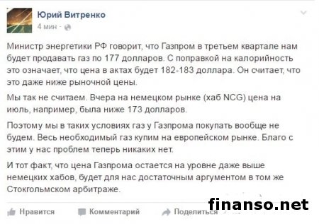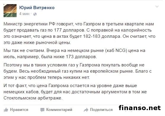Как удалось выяснить корреспондентам новостного интернет-портала «Украина сегодня: Finanso.net», по словам Ю. Витренко, глава российского Минэнерго говорит, что в третьем квартале «Газпром» будет продавать нам газ по 177 долларов. Это означает, что с поправкой на калорийность, цена в актах будет около 182-183 долларов. По утверждению российского министра это даже ниже рыночной цены. «Мы так не считаем, поскольку накануне, 9 июня, на немецком рынке (хаб NCG) цена, к примеру, на июль была 173 доллара», - написал представитель «Нафтогаза». «В таких условиях мы покупать газ у «Газпрома» вообще не будем. Весь необходимый объем этого топлива мы купим на европейском рынке. Теперь никаких проблем с этим нет», - подчеркнул Ю. Витренко. Тот факт, по словам представителя украинского госэнергохолдинга, что цена «Газпрома» остается на уровне даже выше немецких хабов, «станет достаточным аргументом в том же Стокгольмском арбитраже». Напомним, что министр энергетики РФ Александр Новак ранее заявил, что во втором квартале текущего года цена российского газа для Украины составляет 177 долларов за тысячу кубометров, что «вполне соответствует рыночным ценам». В «Нафтогазе» накануне предложили «Газпрому» вернуться в круг поставщиков газа.Несколько дней тому назад в НАК «Нафтогаз Украина» заявляли, что они готовы к возобновлению закупки российского газа, однако при условии конкурентной цены, а также после согласования очередного «зимнего пакета». Об этом сообщала пресс-служба ведомства. В украинском госэнергохолдинге также подтвердили, что они направили «Газпрому» предложение вернуться в круг потенциальных поставщиков. В дополнение к контракту «Нафтогазом» было предложено подписать между сторонами допсоглашение, которое должно урегулировать в течение последующих трех кварталов существующие спорные вопросы относительно поставки в Украину российского газа. В сообщении говорилось, что на протяжении последних полутора лет позиция «Нафтогаза» остается неизменной – закупать газ у «Газпрома» будет возможно, если российская компания предложит более низкую цену, чем европейские поставщики «Нафтогаза». В российских медиаизданиях сообщалось, что «Газпром» получил письмо от украинского «Нафтогаза» с просьбой о возобновлении поставок газа. |