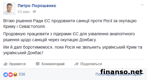«В отношении оккупированного Российской Федерацией Крымского полуострова Европейским союзом были продлены санкции до 23 июня 2017 года, о чем говорится в распространенном заявлении Совета Евросоюза», – пишет РИА «Новости». Как удалось выяснить корреспондентам издания «Украина сегодня: Finanso.net», в пятницу, 17 июня, Совет Европейского союза в рамках стратегии непризнания оккупации полуострова Россией на 12 месяцев – до 23 июня 2017 года – продлил санкционные меры в отношении Крыма и Севастополя. Так, в заявлении СЕ говорится, что экономические санкции в отношении Крыма подразумевают запрет на импорт в страны Европейского союза любых товаров, которые были произведены на полуострове, а также любые инвестиции ЕС в экономику Крымского полуострова, оккупированного Россией. В частности, речь идет о покупке недвижимости, финансировании компаний и оказании других услуг. Помимо прочего, корабли стран – членов Европейского союза не могут заходить в порты Крыма. Стоит отметить и тот факт, что также Европейский союз запретил поставлять на территорию Крымского полуострова некоторые виды товаров и технологий. В том числе нельзя переправлять продукцию энергетической, транспортной и телекоммуникационной сферы, энергетического сектора, природные ресурсы, продукты нефтедобычи и нефтепереработки. Реакция Порошенко.В свою очередь, президент Украины Петр Порошенко прокомментировал решение Совета ЕС продолжить санкции против России за оккупацию Крыма. По его мнению, это позитивный и необходимый шаг. Так, в своем «Фейсбуке» глава государства написал: «Приветствую решение Совета Европейского союза продлить санкции против России за оккупацию Крыма и Севастополя. Продолжаю работать с лидерами ЕС для принятия аналогичного решения о санкциях за оккупацию Донбасса. Мы и дальше будем бороться, пока Россия не освободит украинский Крым и украинский Донбасс!». Напомним, до 23 июня 2017 года продолжены запретительные меры в отношении Крыма и Севастополя в рамках стратегии «непризнания присоединения Крыма к России». В том числе санкции продолжены относительно инвестирования, туристического сотрудничества, импорта продукции из Крыма, а также экспорта некоторых товаров и услуг на полуостров. |