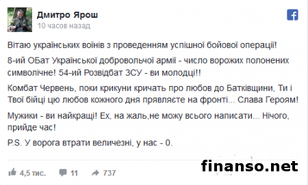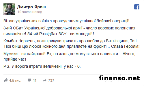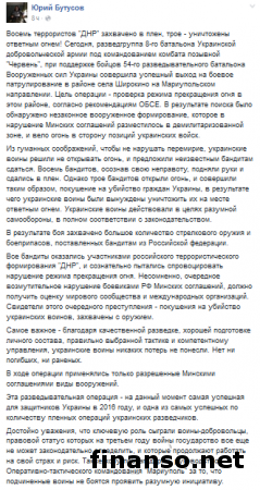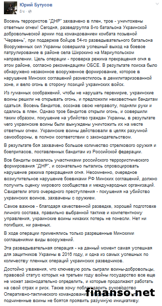 Украинские военнослужащие провели в зоне АТО боевую операцию с успехом.Военнослужащие 8-го отдельного батальона Украинской добровольческой армии захватили в плен восьмерых боевиков. Как передают корреспонденты издания «Украина сегодня: Finanso.net», информацию об этом в своем «Фейсбуке» сообщил Дмитрий Ярош, лидер Национального движения «ДІЯ». В это же время он не сообщал, где именно был осуществлен захват и другие подробности проведенной украинскими бойцами боевой операции. Однако Дмитрий Ярош отметил, что «у врага огромные потери», а вот силы АТО, напротив, остались без потерь. Таким образом, на своей странице Ярош написал: «Украинских воинов поздравляю с успешным проведением боевой операции! Восьмой ОБат Украинской добровольческой армии – число вражеских пленных символическое! 54-й разведывательный батальон Вооруженных сил Украины – вы молодцы! Командир батальона Червень, пока крикуны кричат о своей любви к родине, ты и твои бойцы ежедневно проявляют эту любовь на фронте… К сожалению, написать всего не могу… Ничего, всему свое время!». Спецоперация была проведена в районе Широкино – Бутусов.В свою очередь, журналист Юрий Бутусов подтвердил информацию о проведении успешной спецоперации. В это же время он указал место, где она была проведена. По словам журналиста, украинские военнослужащие 8-го батальона Украинской добровольческой армии, при поддержке бойцов 54-го разведывательного батальона Вооруженных сил Украины, провели успешную спецоперацию в районе поселка Широкино. При этом он добавил, что целью операции была проверка соблюдения перемирия террористами самопровозглашенной Донецкой народной республики. Вооруженные силы Украины во время рейда заметили группировку террористов, которые разместились в так называемой серой зоне, что запрещено согласно соглашениям, достигнутым в Минске. Бойцы ВСУ предложили сдаться боевикам, но трое из них открыли огонь, в результате чего они были ликвидированы. Еще восемь террористов ДНР были взяты в плен. Примечательно, по сообщению журналиста Юрия Бутусова, украинские военнослужащие также захватили большое количество оружия, которое было завезено из Российской Федерации. |