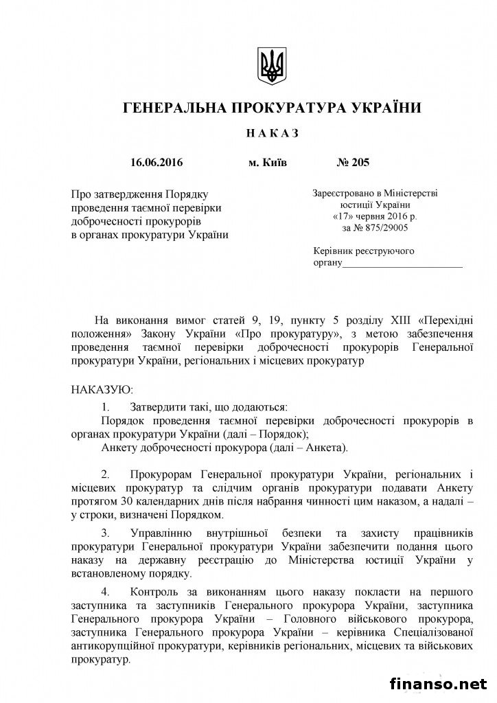 Минюстом Украины 17 июня зарегистрирован приказ Генпрокуратуры, которым утвержден порядок проведения тайной проверки добропорядочности прокуроров в органах прокуратуры. Об этом сегодня сообщила пресс-служба ГПУ. Как удалось выяснить корреспондентам новостного интернет-портала «Украина сегодня: Finanso.net», по информации, согласно этому приказу, прокуроры Генпрокуратуры, а также региональных и местных прокуратур и следственных органов прокуратуры должны подать анкету добропорядочности прокурора в течение 30 дней после вступления в силу этого приказа. Сообщается, что целью проведения указанной проверки будет выявление прокуроров, сообщивших недостоверную информацию в анкете, в том числе о соответствии уровня жизни прокуроров и членов их семей, наличии у них доходов и имущества. Все заполненные анкеты будут обнародованы на официальном сайте ГПУ. В анкете добропорядочности прокуроры должны подтвердить, что не совершали действий, позорящих их звание, что своевременно заполняли декларацию о своих доходах. Также им необходимо указать, что их уровень жизни отвечает получаемым доходам, что они не совершали коррупционных нарушений, что они публично не критиковали других должностных лиц, что они придерживались присяги сотрудника прокуратуры и что они не подпадают под люстрацию. В случае несоответствия сведений будет назначаться служебное расследование.Сообщается, что в случае получения информации, которая может свидетельствовать о недостоверности (в том числе неполноте) сведений, изложенных прокурором в анкете, подразделение внутренней безопасности в десятидневный срок со дня ее получения должно сообщить соответствующему руководителю прокуратуры о необходимости назначения служебного расследования. В свою очередь, тот в семидневный срок должен назначить расследование. По информации, если по результатам тайной проверки добропорядочности будут установлены признаки совершения дисциплинарного проступка, то прокурор будет привлечен к ответственности. Напомним, что ранее, 16 июня, глава ГПУ Юрий Луценко заявил, что вскоре в органах прокуратуры начнется компания проверки на добропорядочность. Генпрокурор Украины подчеркнул, что если подтвердятся факты о несоответствии обнародованных данных, то сотрудник будет уволен из органов прокуратуры. |