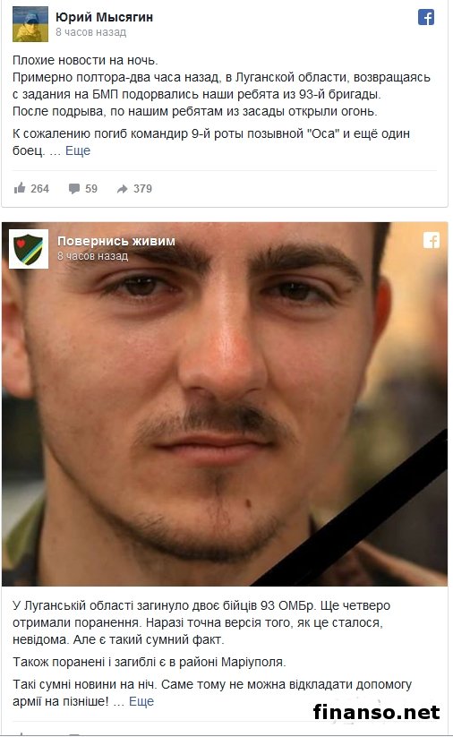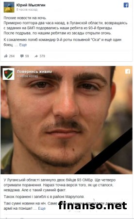 Как удалось выяснить корреспондентам новостного интернет-портала «Украина сегодня: Finanso.net», по информации, военные возвращались с задания на БМП, когда внезапно боевая машина взорвалась, после чего из засады по украинским бойцам открыли огонь. Сообщалось, что в результате погибло двое военных и один из них – командир 9-й роты с позывным «Оса». Волонтер добавил, что три человека получили ранения, в том числе ротный 7-й роты с позывным «Стаф». При этом один из раненых находится в тяжелом состоянии и за его жизнь борются врачи в Северодонецке. О четырех раненых сообщили волонтеры организации «Вернись живым». По сведениям этой организации, погибшие и раненые есть на Мариупольском направлении. Вследствие артобстрела ВСУ понесли потери под Зайцево.Напомним, что в этот же день террористы обстреляли украинских военных в районе Зайцево, нанеся прямой удар по позициям ВСУ, из-за чего есть погибшие. Об этом сообщил на своей странице в «Фейсбуке» журналист Роман Бочкала. Он надеялся, что это не подтвердится и не хотел писать. Но в Генштабе сказали, что это действительно так. «Вчера с утра в районе между Майорском и Зайцево было прямое попадание в позиции 53-й бригады», - написал Р. Бочкала. Украинские военные, по данным журналиста, понесли серьезные потери. В частности, погибли четверо бойцов ВСУ и еще трое были ранены. Р. Бочкала написал: «Не ограничивая себя в калибре, противник использовал 120 мм и 150 мм снаряды. Вести ответный огонь нашим бойцам никто не запрещает. Но у них в наличии только стрелковое оружие, гранатометы и АГС». «Все тяжелое отведено. Так и воюем», - резюмировал журналист. В последнее время, отдельно отметил он, ситуация в районе Зайцево заметно обострилась. Журналист подчеркнул, что у наших ребят ежедневные потери. «Помянем погибших», - добавил он. Напомним, ранее тергруппировка ДНР обстреляла из минометов Авдеевку. Вследствие обстрела сгорело два дома. Осколочное ранение получил мужчина 1974 года рождения. |