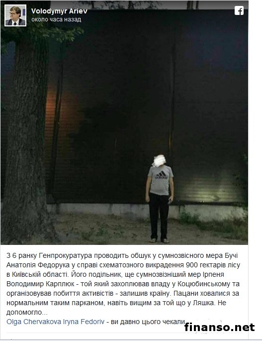 Корреспонденты новостного интернет-портала «Украина сегодня: Finanso.net» информируют, что, по словам В. Арьева, А. Федорук является фигурантом в деле о расхищении с использованием соответствующих схем 900 га леса в Киевской области. Нардеп также отметил, что в три часа ночи покинул страну его подельник, печально известный мэр Ирпеня Владимир Карплюк. «Тот, который захватывал власть в Коцюбинском и организовывал избиение активистов. Ребята прятались за высоким забором, даже большим, чем у Ляшко. Но это не помогло», – резюмировал парламентарий. Факт обысков также подтвердила на своей странице в соцсети «Фейсбук» пресс-секретарь главы ГПУ Лариса Сарган, подчеркнув, что обыски проходят также и Ирпене. Она написала в соцсети, что обыски проходят в Ирпене и Буче. «Итак, высокие заборы не останавливают», – отметила она. Мэры Бучи и Ирпеня между собой кумовья.Напомним, что Анатолий Федорук руководит Бучей с 1998 г. На местных выборах осенью прошлого года А. Федорук баллотировался на должность бучанского головы как самовыдвиженец. В то же время В. Карплюк одержал победу на выборах мэра Ирпеня как кандидат от партии «Новые лица». Сообщалось, что А. Федорук является владельцем огромного домостроения с собственным крытым бассейном, летним домиком, садом и идеальными газонами. Строения расположились на общей площади в полгектара. Чиновник, согласно декларации, за прошлый год получил почти 124 тыс. зарплаты. При этом его жена заработала больше 18 млн. грн. Одиозный кум А. Федорука, мэр соседнего Ирпеня В. Карплюк занял второе место в указанном рейтинге. Согласно обнародованной за 2014 г. декларации, он владеет 67 квартирами при ежемесячной зарплате в шесть тысяч гривен. При этом уже в декларации за прошлый год количество квартир у В. Карплюка резко уменьшилось, составив только 23. Следует отметить, что жены кумовьев являются учредителями предприятия «Стройрегионинвест», связанного с рядом частных застройщиков, которые в течение двух лет при находившемся на должности мэре построили несколько элитных жилищных комплексов в Ирпене и Буче. |