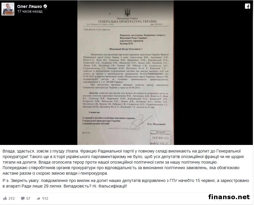 Как удалось выяснить корреспондентам новостного интернет-портала «Украина сегодня: Finanso.net», такое заявление было сделано О. Ляшко и распространено масс-медиа 13 мая прошлого года. Сообщается, что до этого времени, несмотря на направленные в адрес О. Ляшко 20 повесток о вызове на допрос в качестве свидетеля в уголовном производстве, эти документы были им проигнорированы, а о причинах неявки в органы досудебного расследования не сказано. Согласно информации ГПУ, в своем заявлении масс-медиа О. Ляшко подчеркнул, что неправомерная выгода предлагалась как ему, так и одному из депутатов его фракции. Исходя из этого, с целью допроса в качестве свидетелей органом досудебного расследования вызваны все украинские парламентарии фракции РП Олега Ляшко. Расследование правонарушения проводится Управлением спецрасследований ГПУ.В сообщении подчеркивается, что названное расследование проводится Управлением спецрасследований ГПУ по признакам уголовного правонарушения, предусмотренного ч. 1 ст. 368 Уголовного кодекса. Напомним, что ранее сообщалось, что всех депутатов парламентской фракции РП вызывают на допрос в Генпрокуратуру. Об этом на своей странице в соцсети «Фейсбук» сообщил лидер этой фракции Олег Ляшко. По его словам, в истории украинского парламентаризма такого еще не было, чтобы всех депутатов оппозиционной фракции чуть ли не ежедневно таскали на допросы. «Фракцию РП в полном составе вызывают на допрос в ГПУ», – написал О. Ляшко. При этом лидер РП прикрепил к записи фото письма ГПУ в Аппарат парламента от 15.06.2016 г., в котором речь идет о направлении повесток с сопроводительными листами на вызов на допрос 21 парламентария с просьбой организации их вручения для допроса, как свидетелей в уголовном производстве от 14.05.2015 г. по факту предложения О. Ляшко неправомерной выгоды по признакам уголовного правонарушения согласно ч. 1 ст. 369 УКУ. Прокуратура просила по результатам вручения этих повесток сообщить до 3 июля. |