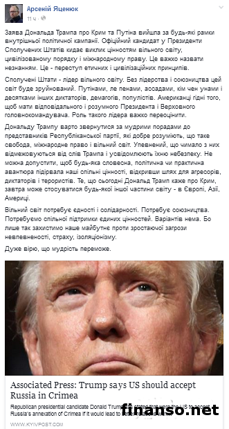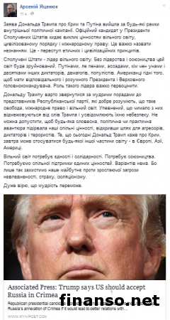 Бывший глава украинского правительства Арсений Яценюк расценил слова кандидата в президенты США Дональда Трампа об аннексированном Крыме как «вызов ценностям свободного мира».Как передают корреспонденты новостного интернет-портала «Украина сегодня: Finanso.net», на своей странице в социальной сети «Фейсбук» Арсений Яценюк сообщил, что заявление Дональда Трампа, являющегося кандидатом в президенты Соединенных Штатов Америки от Республиканской партии, о Крыме и Владимире Путине вышло за любые пределы внутриполитической кампании. Так, экс-премьер написал: «Таким образом, официальный кандидат в президенты Америки бросил вызов ценностям свободного мира, цивилизованного порядка и международного права. Назвать это незнанием нельзя. Это преступление этических и цивилизованных принципов». Бывший председатель Кабинета министров Украины считает, что граждане Соединенных Штатов Америки заслуживают более ответственного и умного президента, нежели Дональд Трамп. В своем сообщении экс-премьер отметил: «Соединенные Штаты – лидер свободного мира. Этот мир будет разрушен без лидерства и союзничества такими людьми, как Путин, Ассад, Ле Пен, Ким Чен Ын и десятками других демагогов, диктаторов, популистов. Жители Америки достойны того, чтобы иметь умного и ответственного президента и Верховного главнокомандующего. Тяжело переоценить роль такого лидера». Согласно словам Арсения Яценюка, Трампа в позиции касательно Автономной Республики Крым поддерживает не вся Республиканская партия. Бывший чиновник резюмировал: «В США есть хорошо понимающие, что такое мир и свобода, свободный мир и международное право представители Республиканской партии, и Дональду Трампу стоит обратиться к ним за мудрыми советами. Я убежден в том, что многие из таких людей не согласны со словами Трампа по Крыму и вполне осознают их опасность. Невозможно допустить, чтобы любая политическая, практическая или словесная авантюра подорвала наши общие ценности, открыв путь для агрессоров, террористов и диктаторов. Уже завтра любой части мира – в Азии, Европе, США может касаться то, что сегодня Дональд Трамп говорит про Крым». |